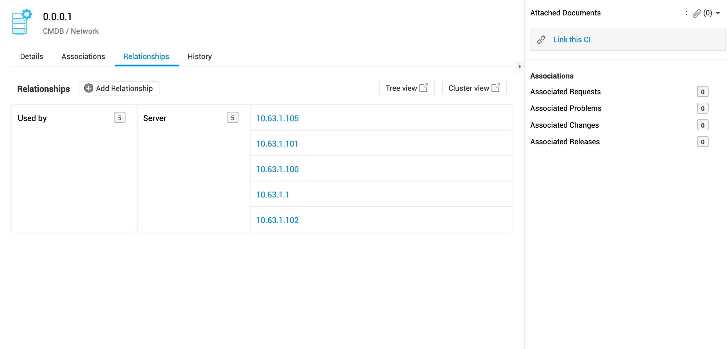 可在 CI 详细信息页面的“关系”选项卡中查看某个 CI 的关系。