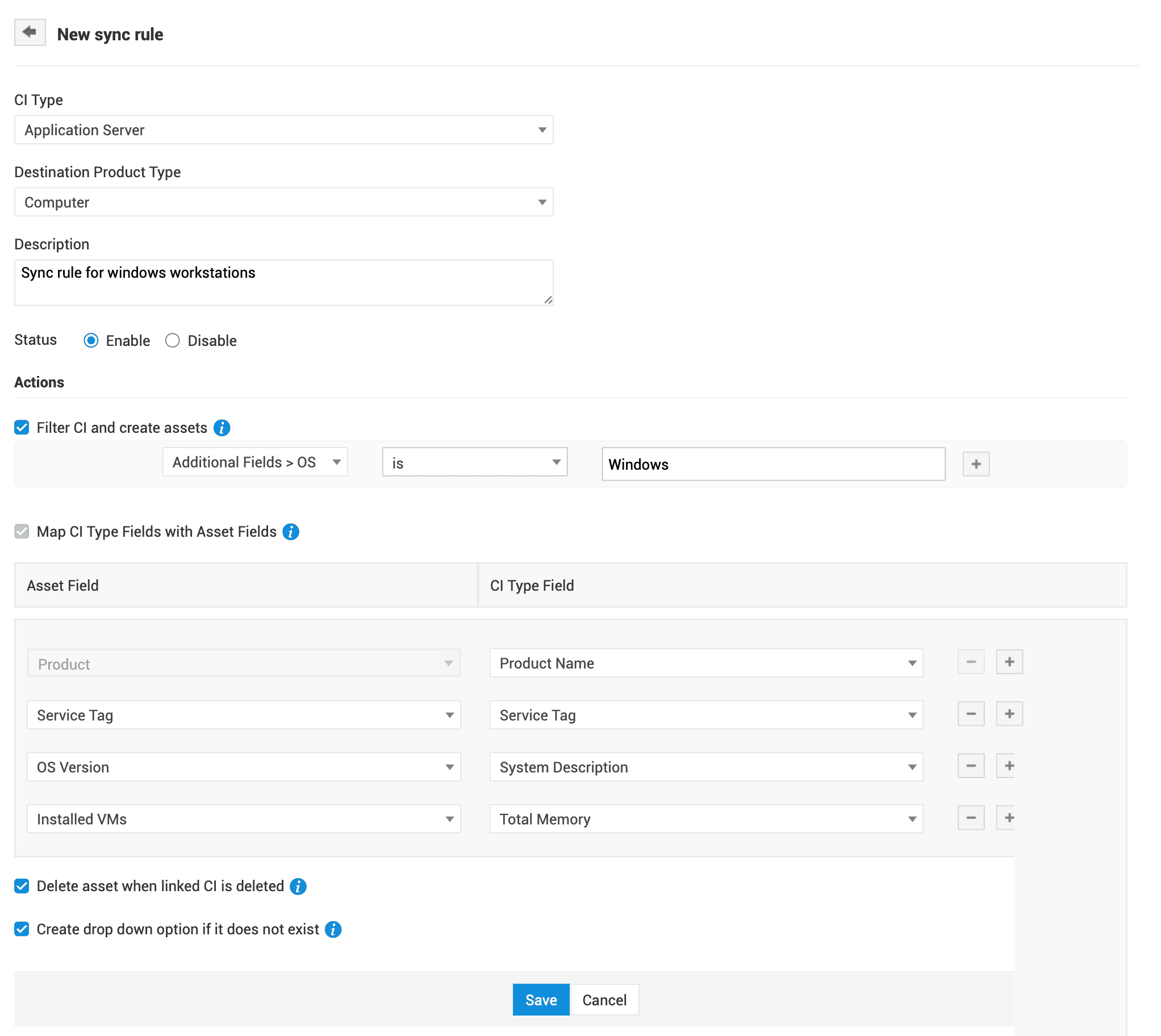 使用同步规则,您可以定义要同步哪些 CI 以及同步其中哪些数据。对 CI 中数据所做的任何更改都会反映到相应的资产中。