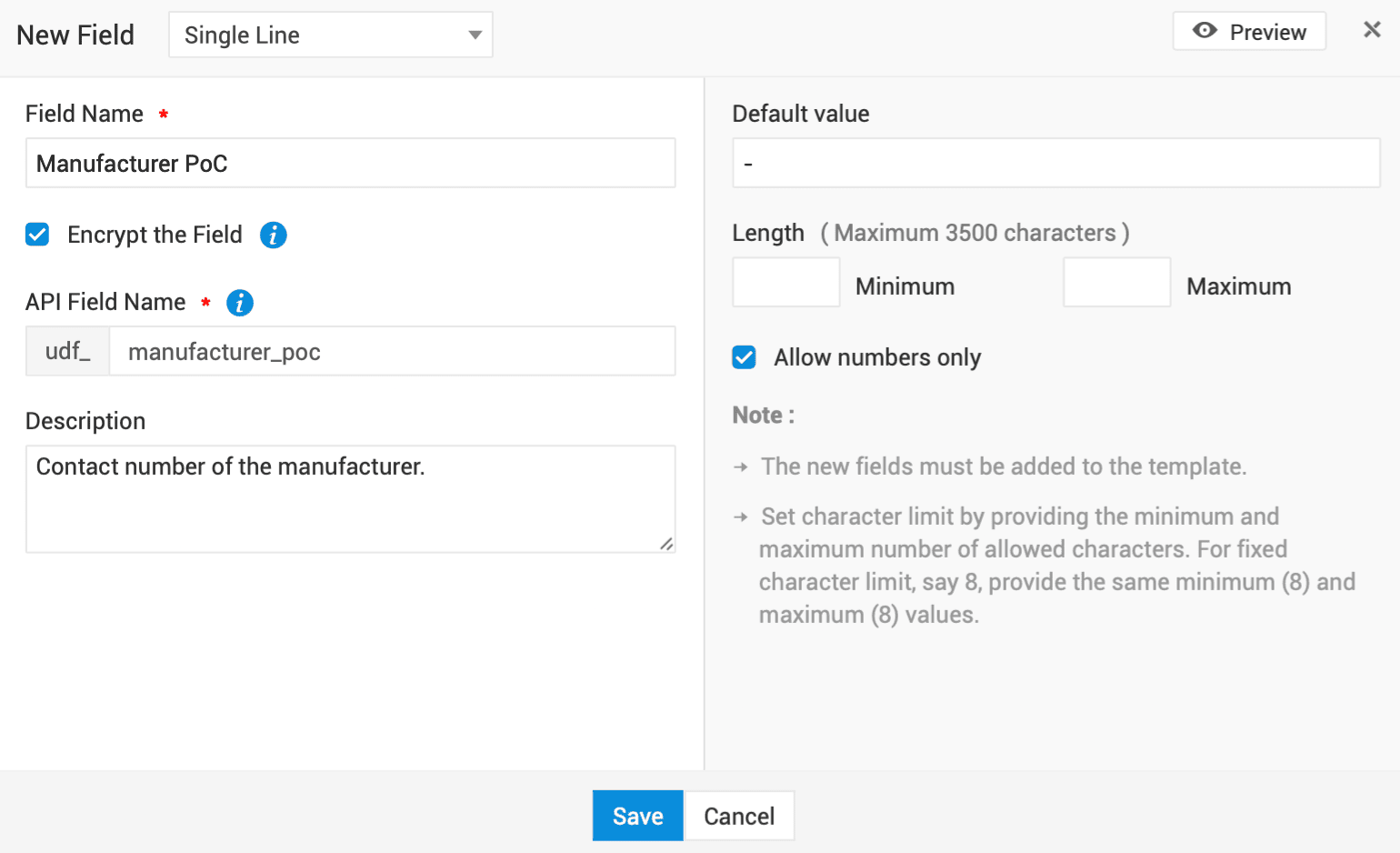 除了默认字段之外,您还可以定义组织专用字段,并将其包含在新建资产表单中。您可以在表单中添加文本字段、数字字段以及日期/时间字段。