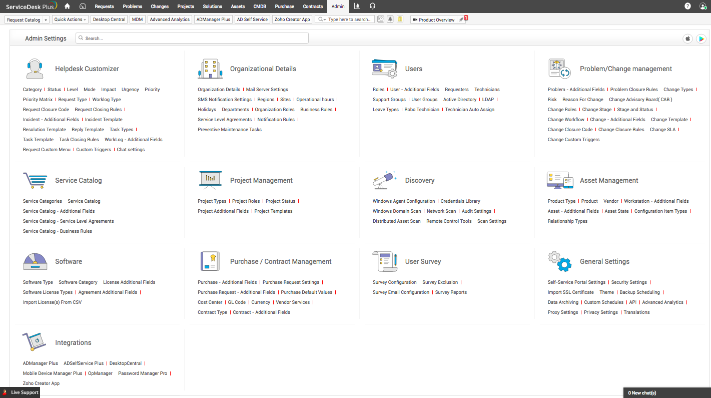 管理员主页列出了管理员必须在各个模块下配置的所有 ServiceDesk 功能。要访问此页面,请确保您已使用管理员凭据登录。