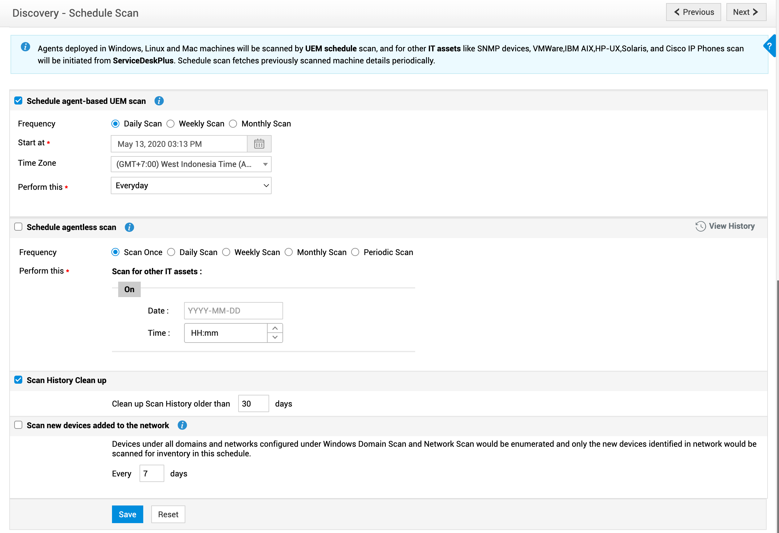 安排时间和频率,以同步先前已扫描资产的信息,并扫描新添加到网络中的资产。ServiceDesk Plus 允许您为带有和不带有 UEM 代理的 IT 资产配置不同的扫描计划。