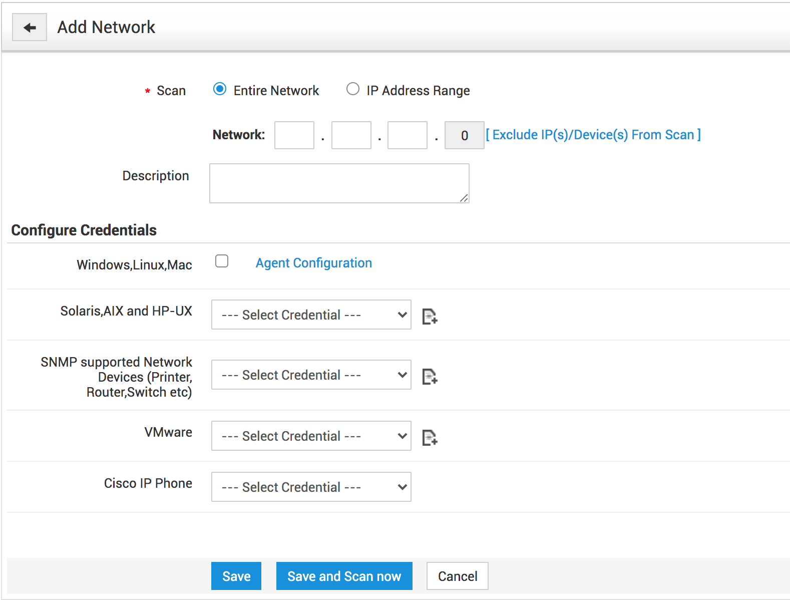 使用网络扫描功能发现属于您组织的网络,并按固定时间间隔对其进行扫描。除了可扫描 Windows、Linux、MAC、Solaris 和 AIX 工作站等各种操作系统外,网络扫描还支持扫描 SNMP 设备和 VMware 计算机。