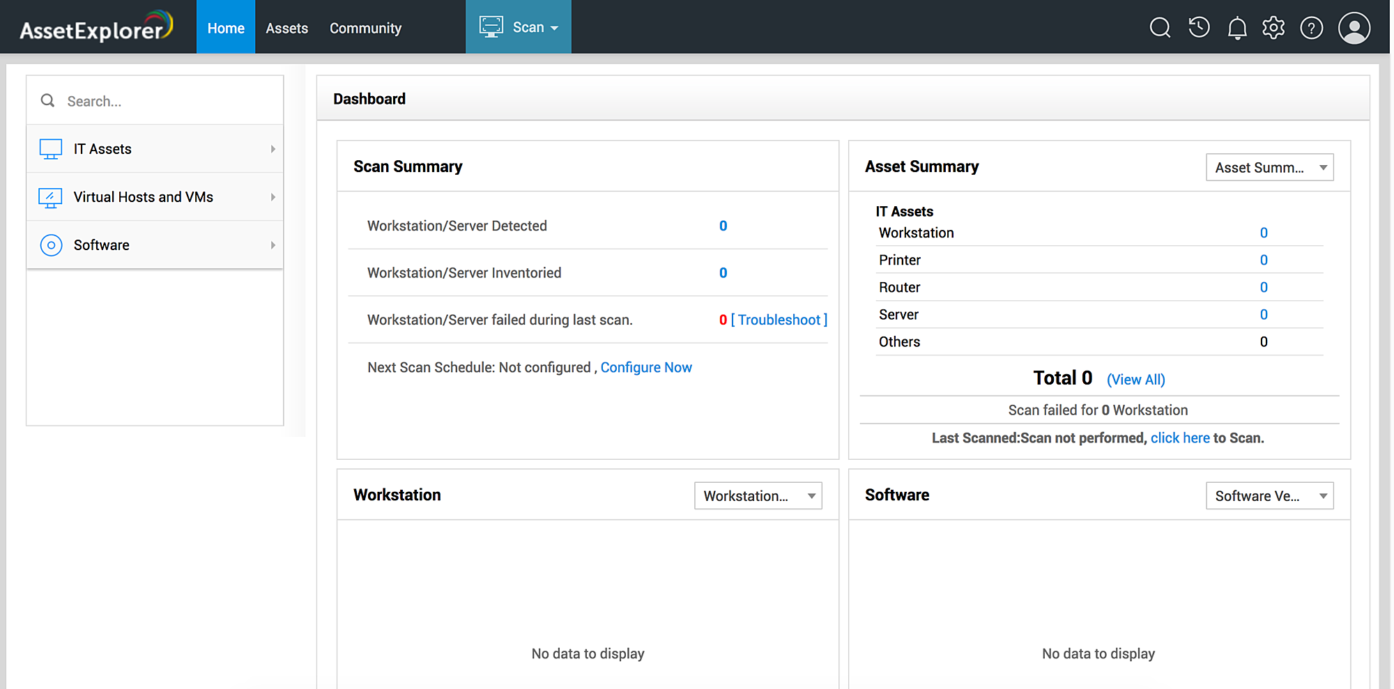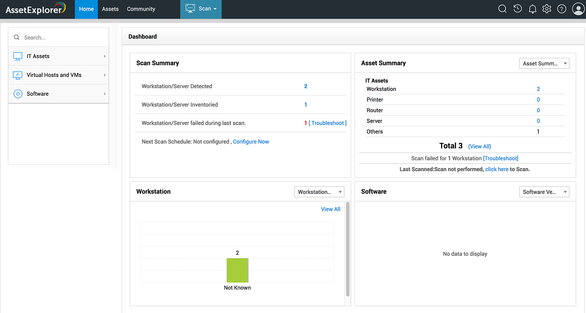 在主页下,您可以查看扫描和资产摘要,还可以查看工作站和Server中的软件安装情况。