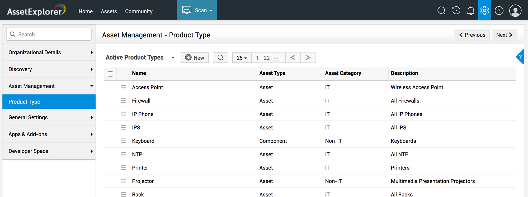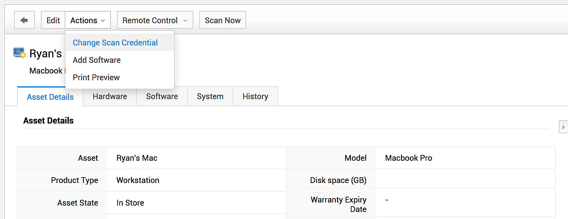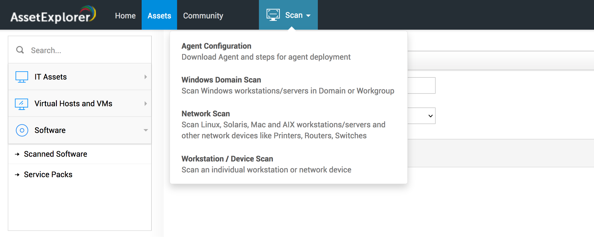 您可以使用以下可用的扫描方式执行资产扫描:Windows 域扫描、网络扫描、工作站/设备扫描。使用“扫描”下拉菜单执行所需的扫描。