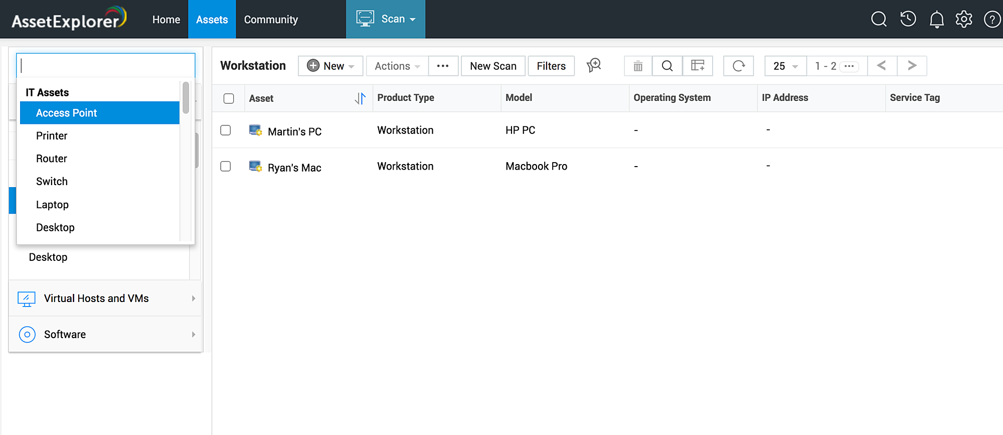 您可以扫描工作站、Server以及交换机和route等 SNMP 设备。使用左侧导航可访问 IT 资产、虚拟主机和软件。