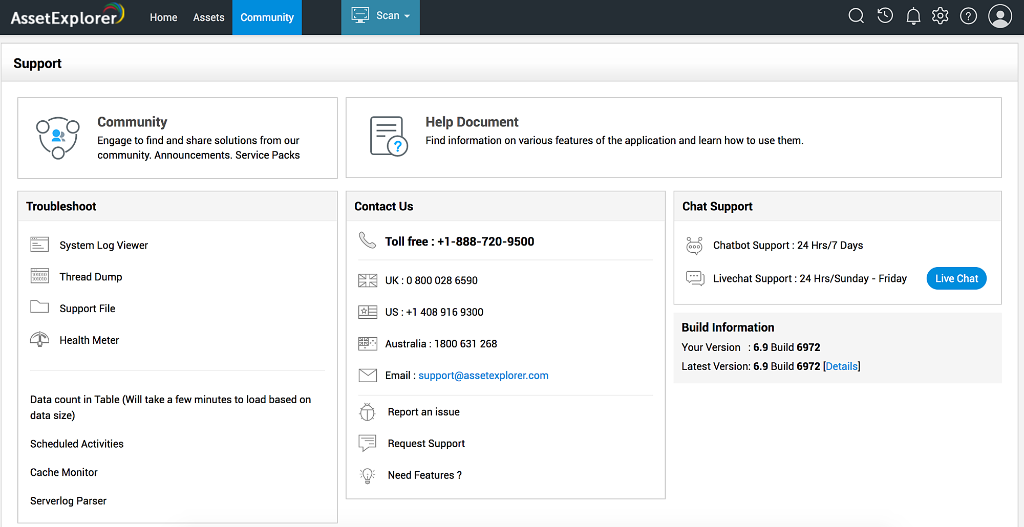 使用社区选项卡可查找并分享来自 AssetExplorer 用户社区的解决方案。您还可以收到公告和服务包发布通知。