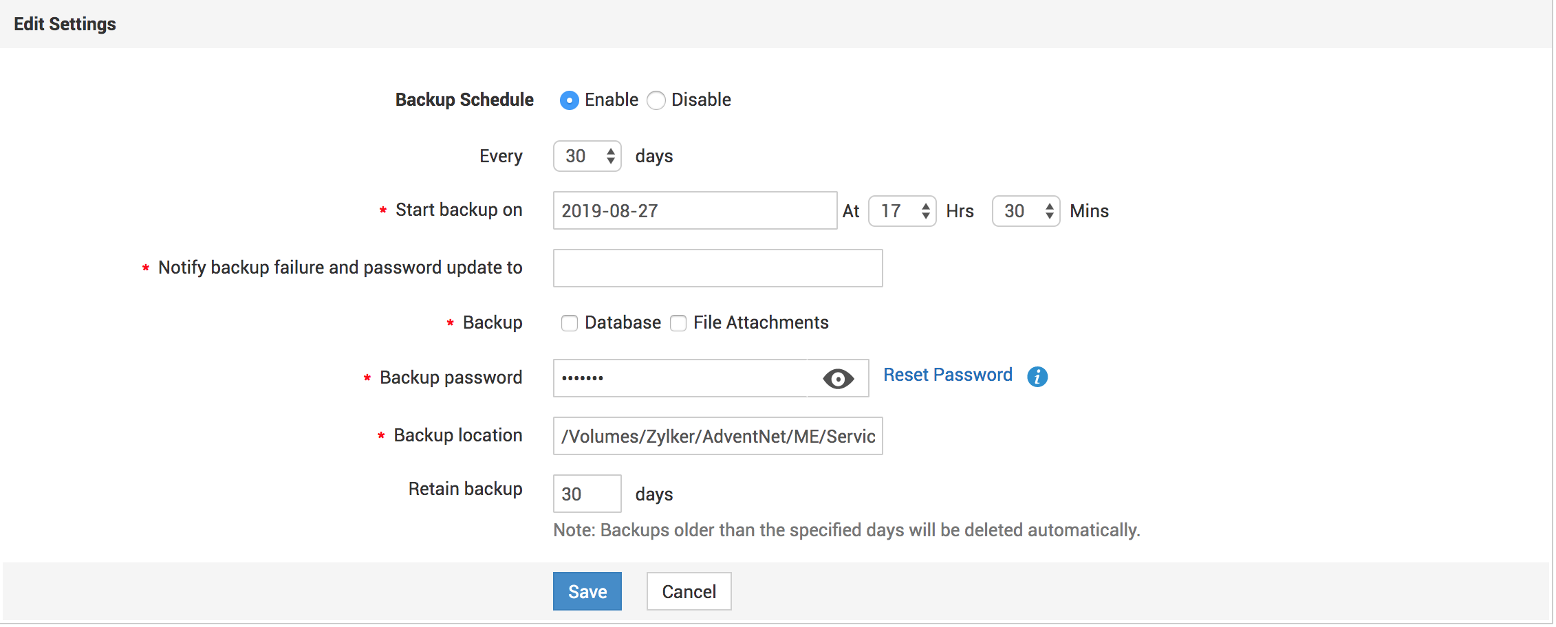 您将需要使用密码来访问备份文件。SDAdmin 在安排备份时配置该密码。可以在“备份计划”主页中查看和重置该密码。此密码也适用于所有手动备份以及按计划备份的文件。
