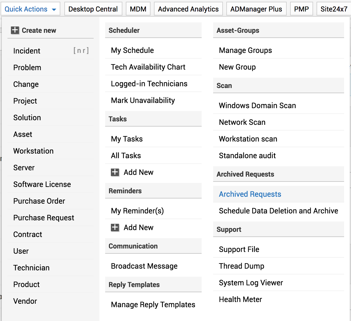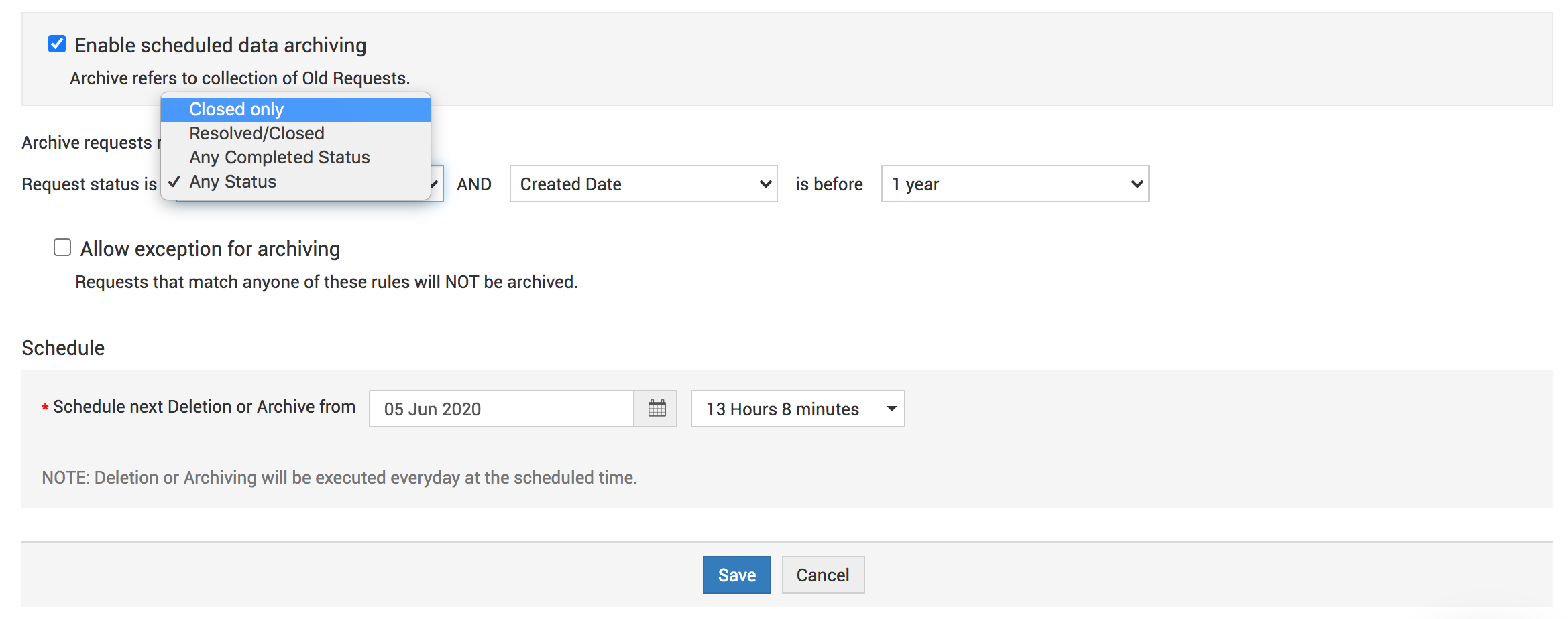 ServiceDesk Plus 允许您删除不需要的请求数据或归档旧请求。以下文档说明了如何配置数据删除和归档计划。