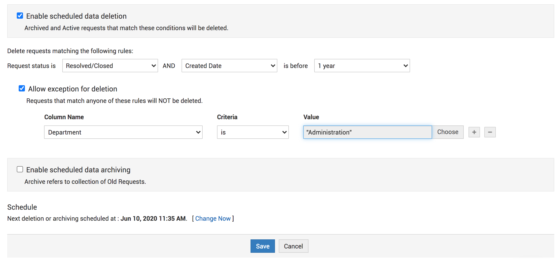 例如,您可以将行政部门的请求排除在计划数据删除之外。为此,请在规则部分选择以下值: 列名 - 部门,条件 - 是,值 - 行政。您可以通过单击加号图标添加多个规则。设置好条件后,通过指定小时和分钟来设置数据删除计划,然后单击 保存。