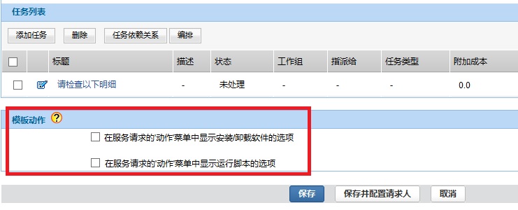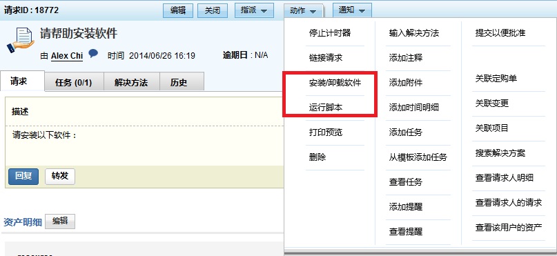 在服务请求的页面中,点击动作下拉菜单,就会显示出安装/卸载软件和运行脚本菜单: