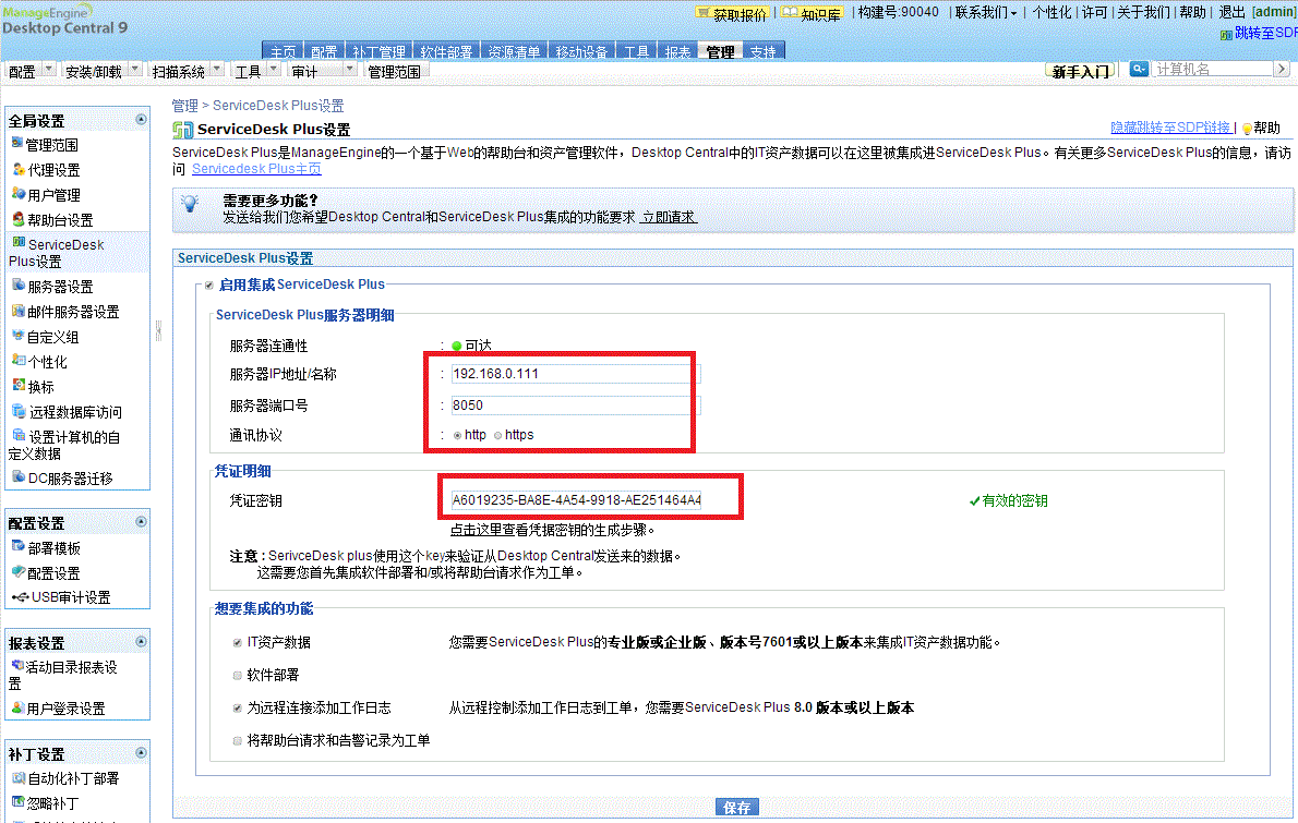 以管理员登录到DC,点击DC中的管理 >> ServiceDesk Plus的设置,然后在其中,输入SDP的主机名/IP地址,端口,以及上述生成的密钥。点击保存。