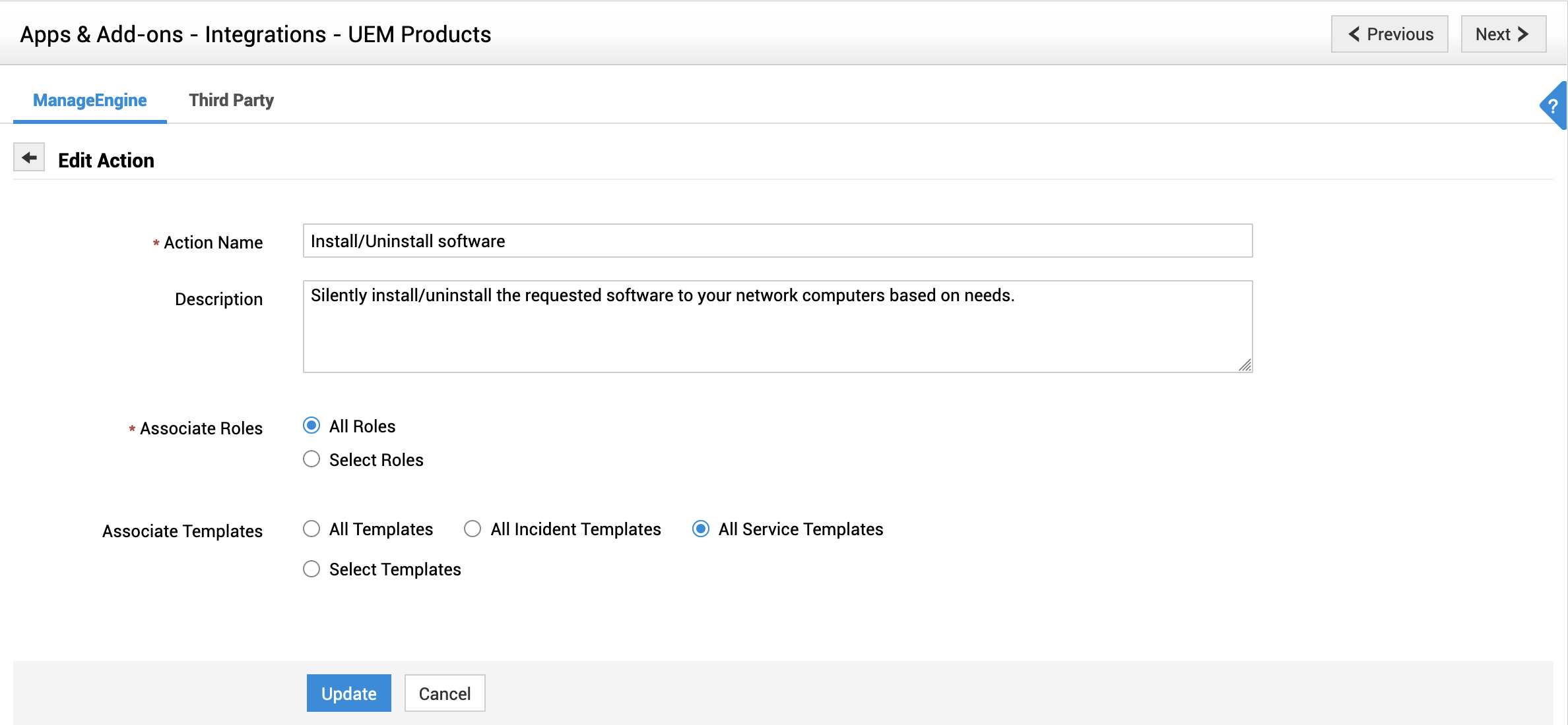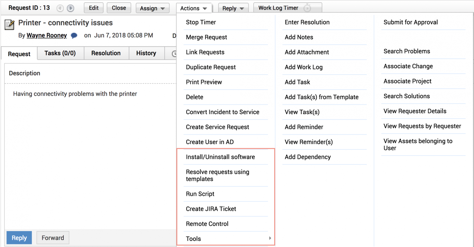 因此,当最终用户提交“安装软件”的服务请求时,具有 Endpoint Central 角色的技术人员可以登录 ServiceDesk Plus application并执行安装操作。