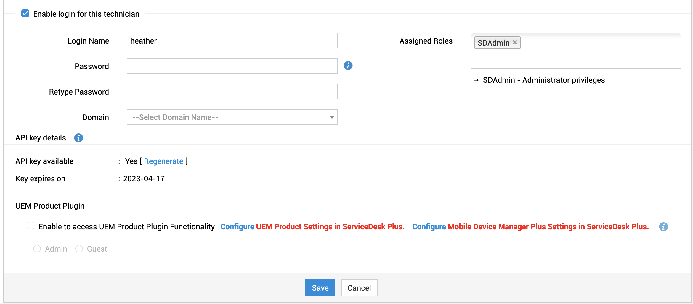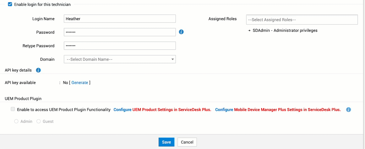 在为技术人员启用登录权限时,您还可以为该技术人员提供 Endpoint Central 登录访问权限和 Endpoint Central 角色。两个 Endpoint Central 角色分别是 Endpoint Central Admin 和 Endpoint Central Guest。选中“启用以访问 UEM 产品插件功能”复选框,并为技术人员分配其中一个角色。当技术人员使用其凭据登录 ServiceDesk Plus 时,即可查看 Endpoint Central 下拉菜单,并通过该菜单在 ServiceDesk Plus Web 控制台中执行桌面管理功能。