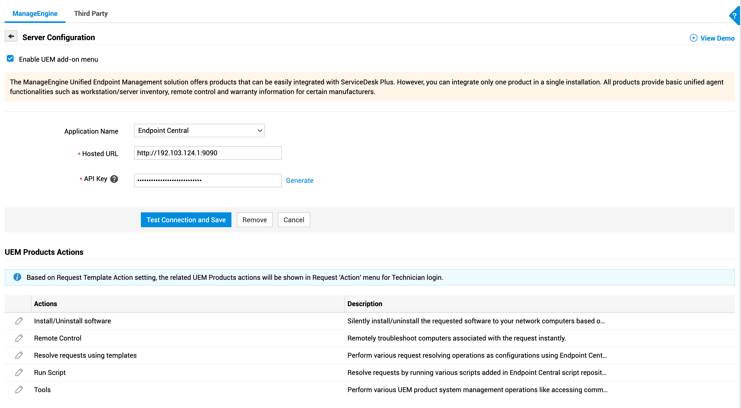 点击 测试连接并保存。设置将被保存,ServiceDesk Plus 会尝试与 Endpoint Central Server建立连接。连接建立后,ServiceDesk Plus 会从 Endpoint Central 获取软件详细信息和脚本。