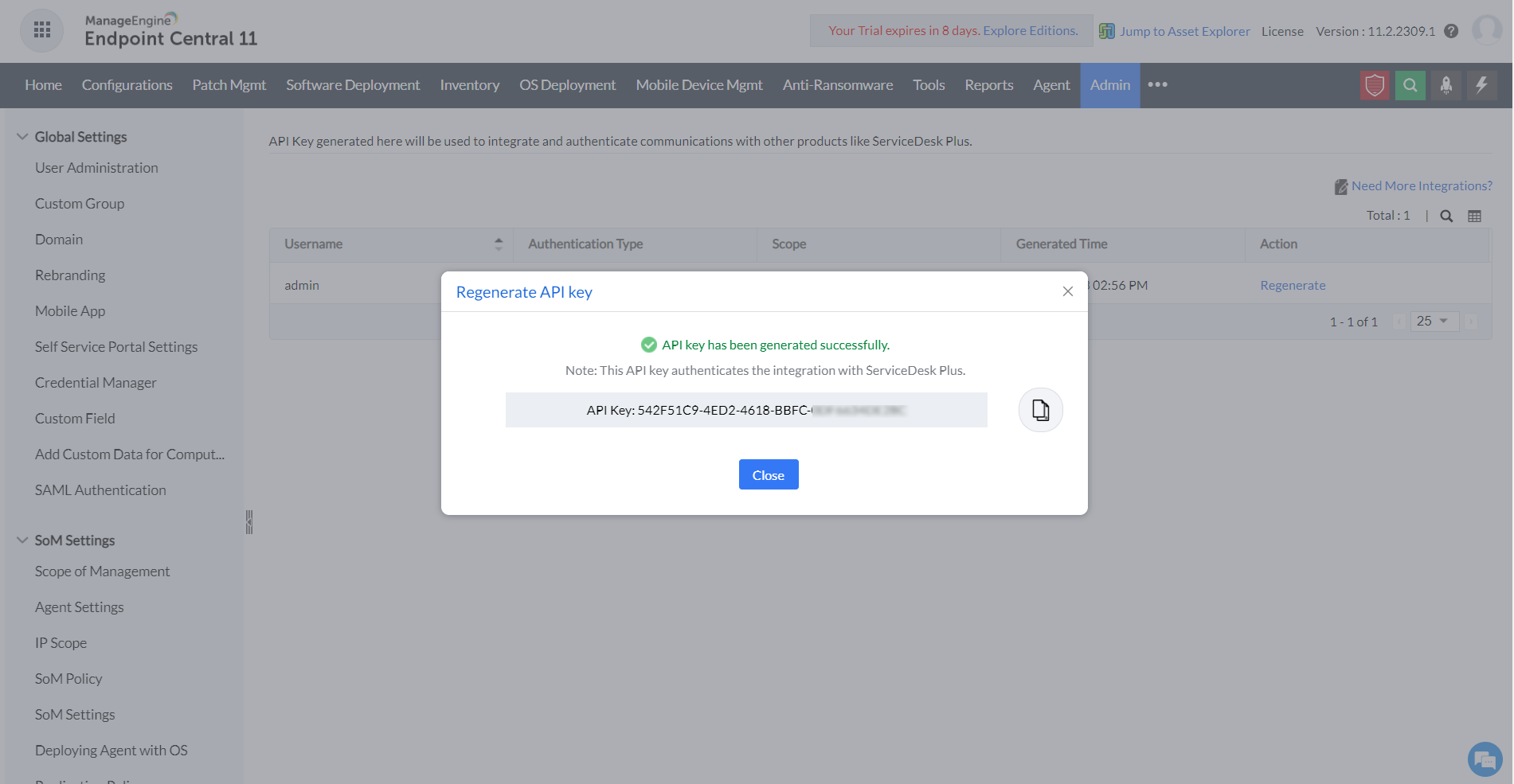 点击 更改 API 密钥。输入您从 Endpoint Central 获取的管理员 API 密钥,或点击 生成以创建新的 API 密钥。