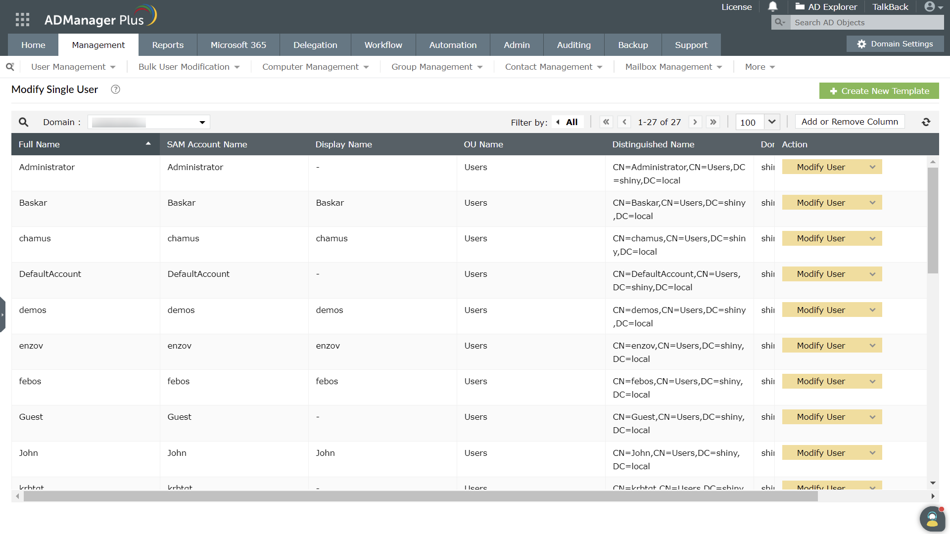 5. 用户将成功在 AD 中创建。您可以在 ADMP 的 AD 管理 > 修改单个用户 中,通过筛选所创建用户的域来查看已添加的 AD 用户。