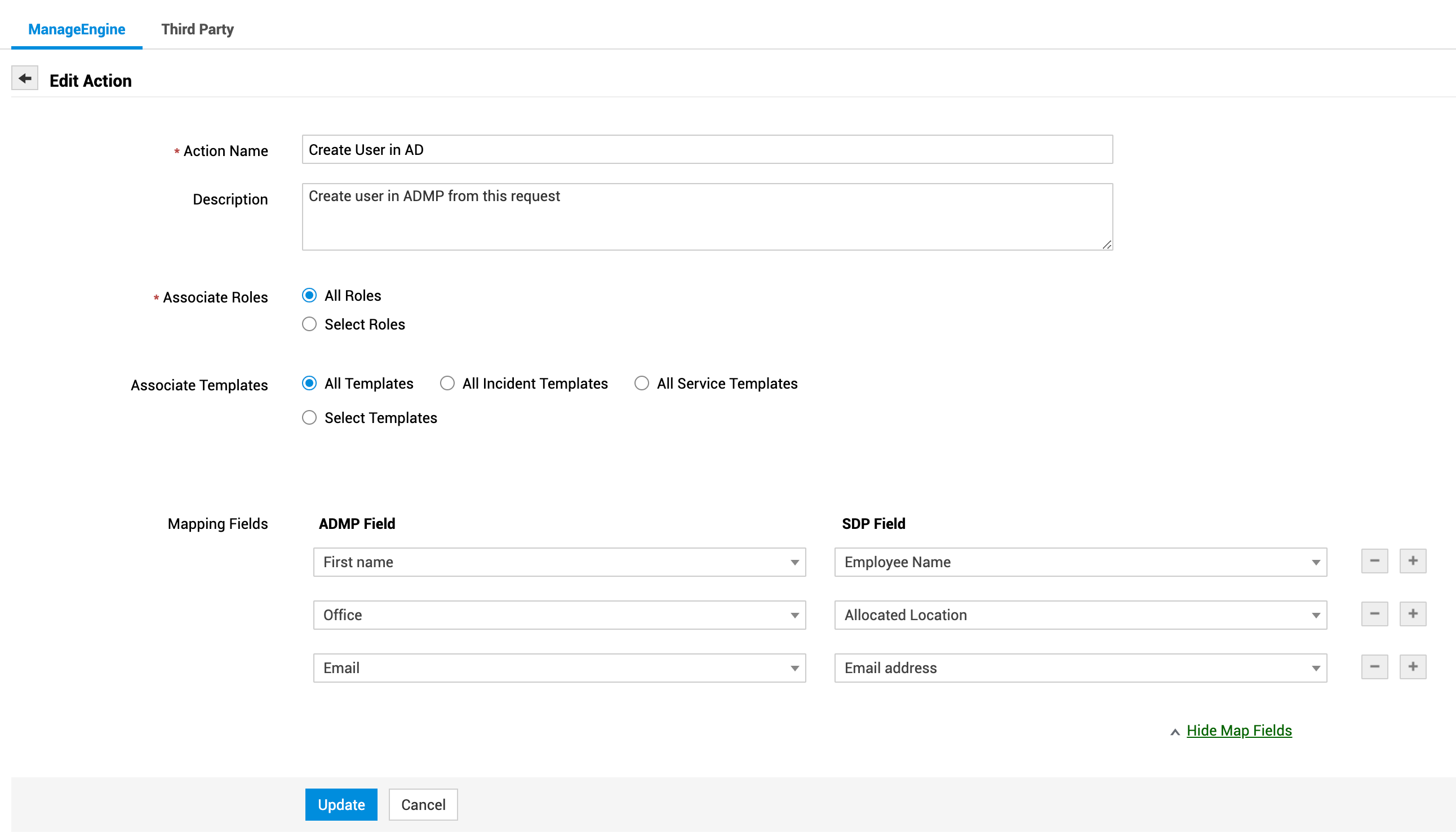 您可以映射在通过 ServiceDesk Plus 请求创建 AD 用户时需要更新的 ADManager Plus 字段。