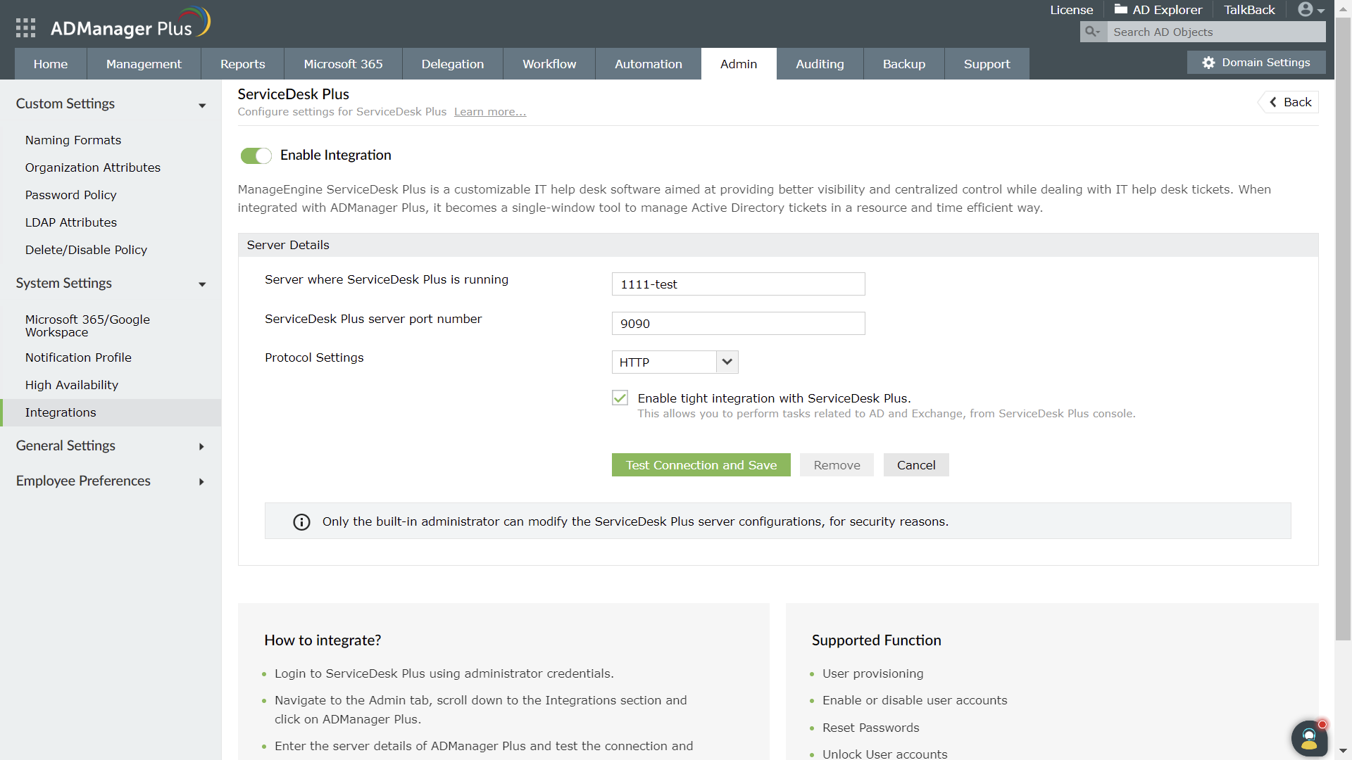 转到 管理 > 应用和附加组件 > 集成 > ADManager Plus。
