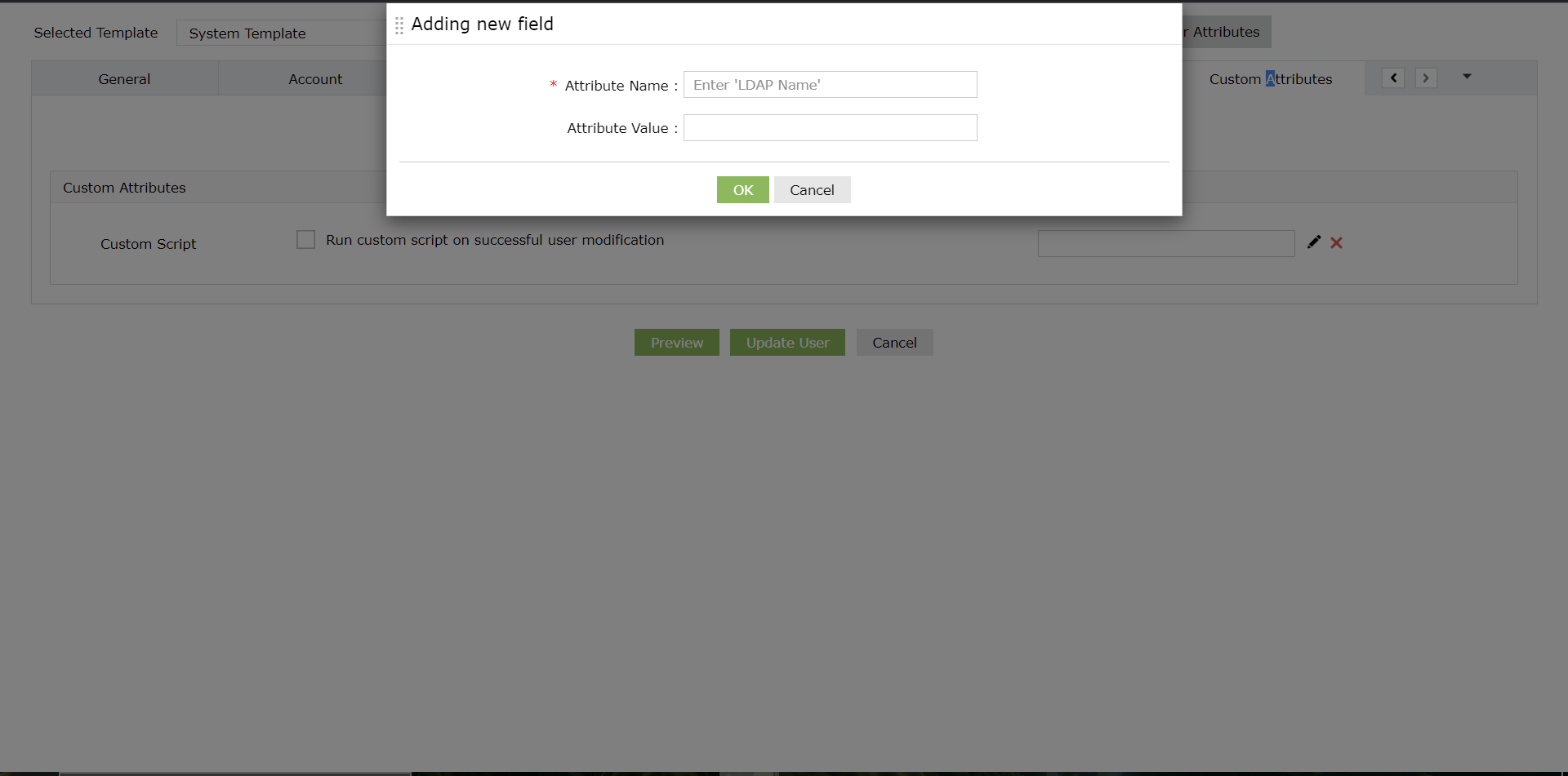 6. 单击 修改用户 下拉按钮 > 修改用户属性 ,查看已添加用户的详细信息(也包括所添加附加字段的详细信息)。请确保在 SDP 中添加的附加字段在 ADMP 中可作为默认属性字段使用。您可以通过此文件查看 ADMP 中可用的默认属性。如果创建的附加字段及其详细信息在 ADMP 中默认不受支持,请在 自定义属性 > 添加新字段下创建新的自定义属性。