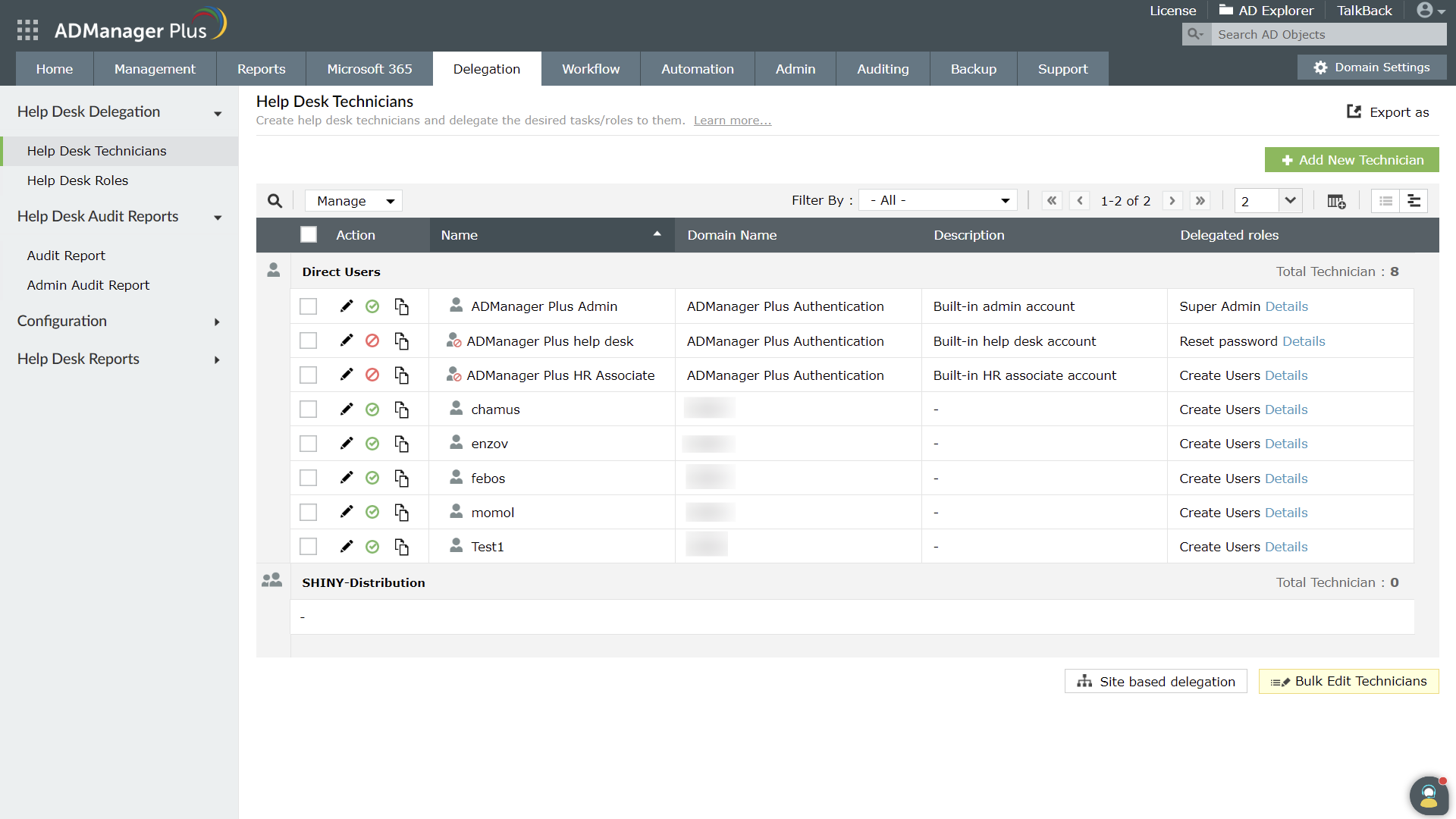 ADManager Plus 中服务台技术人员的登录名和域名应与 ServiceDesk Plus 中保持一致。