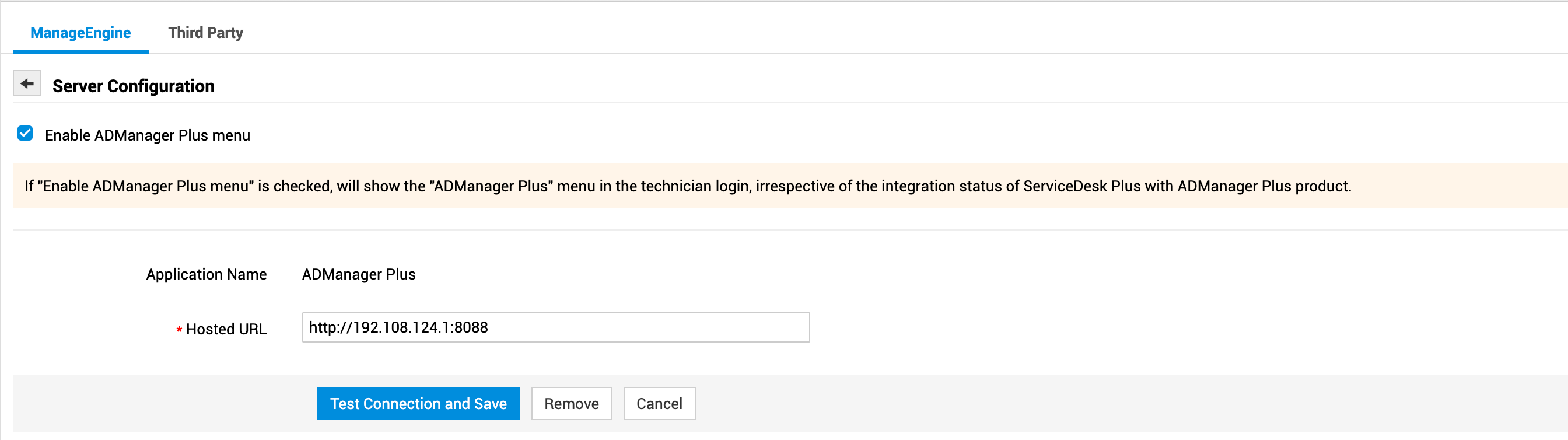 必须在 ADManager Plus 中输入并配置以下设置。这些设置位于 ADManager Plus 的 管理 > 常规设置 > ServiceDesk Plus 下。