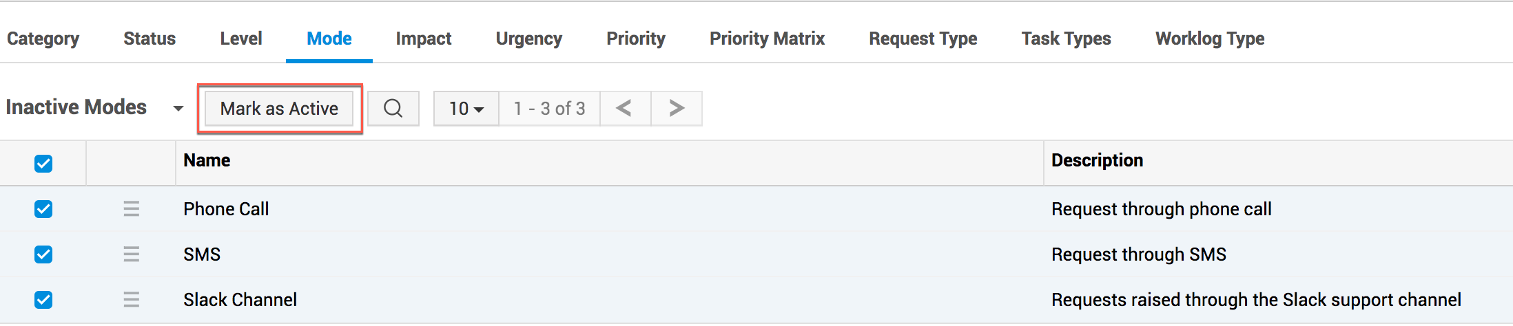 要重新激活非活动模式,请使用筛选下拉菜单转到 非活动模式。选择这些非活动模式,然后单击工具栏上的 标记为活动 按钮。