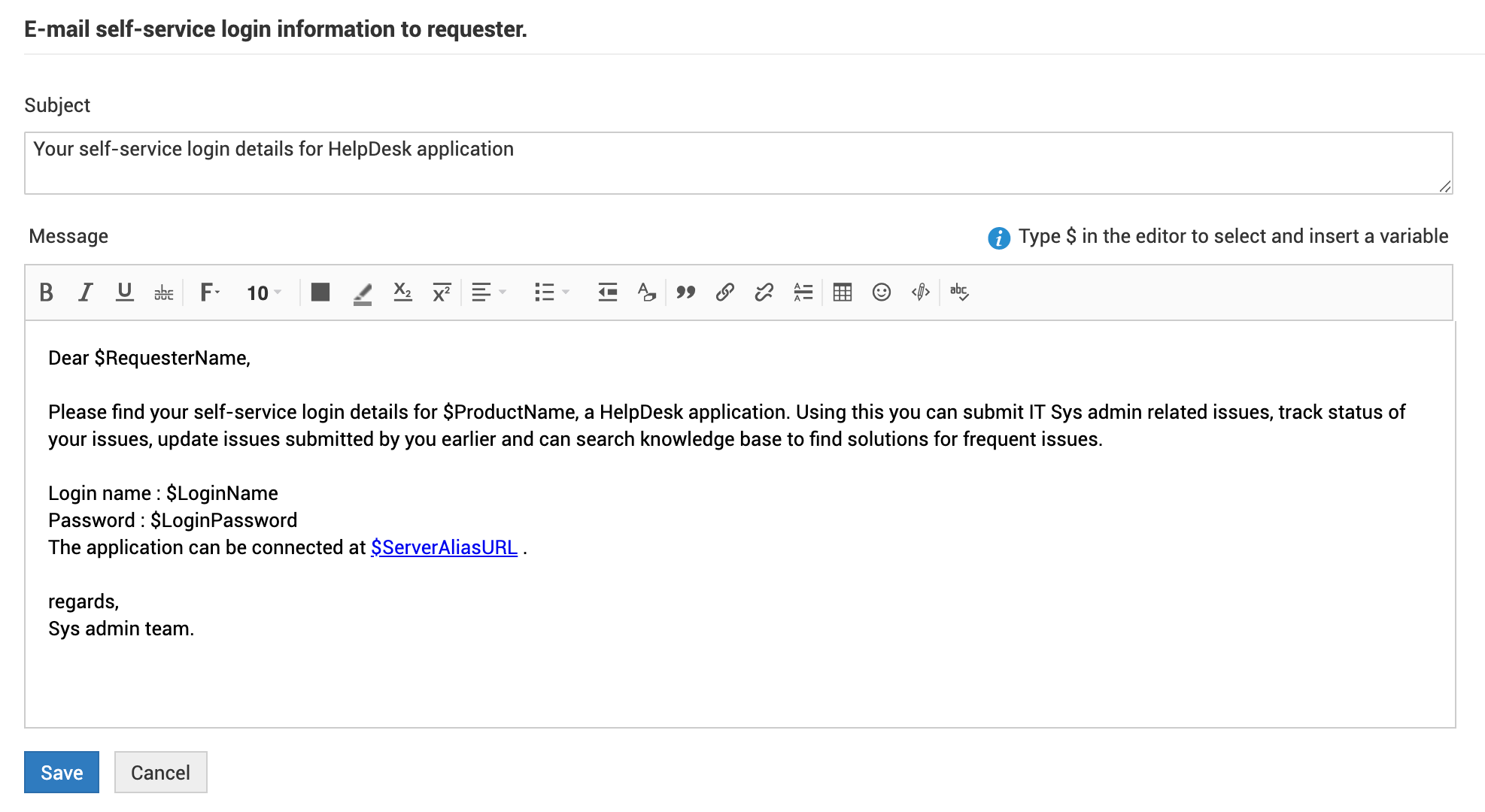 分别替换通知描述或通知主题。在通知模板中输入 $ 时,将列出这些变量。