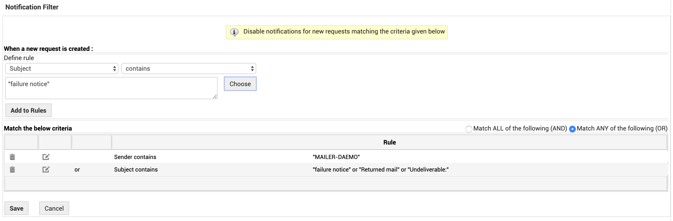 垃圾通知筛选器可防止当信息邮件到达帮助台时,向请求者/技术人员发送不需要的确认或通知。这些邮件不是请求,不需要采取任何操作。
