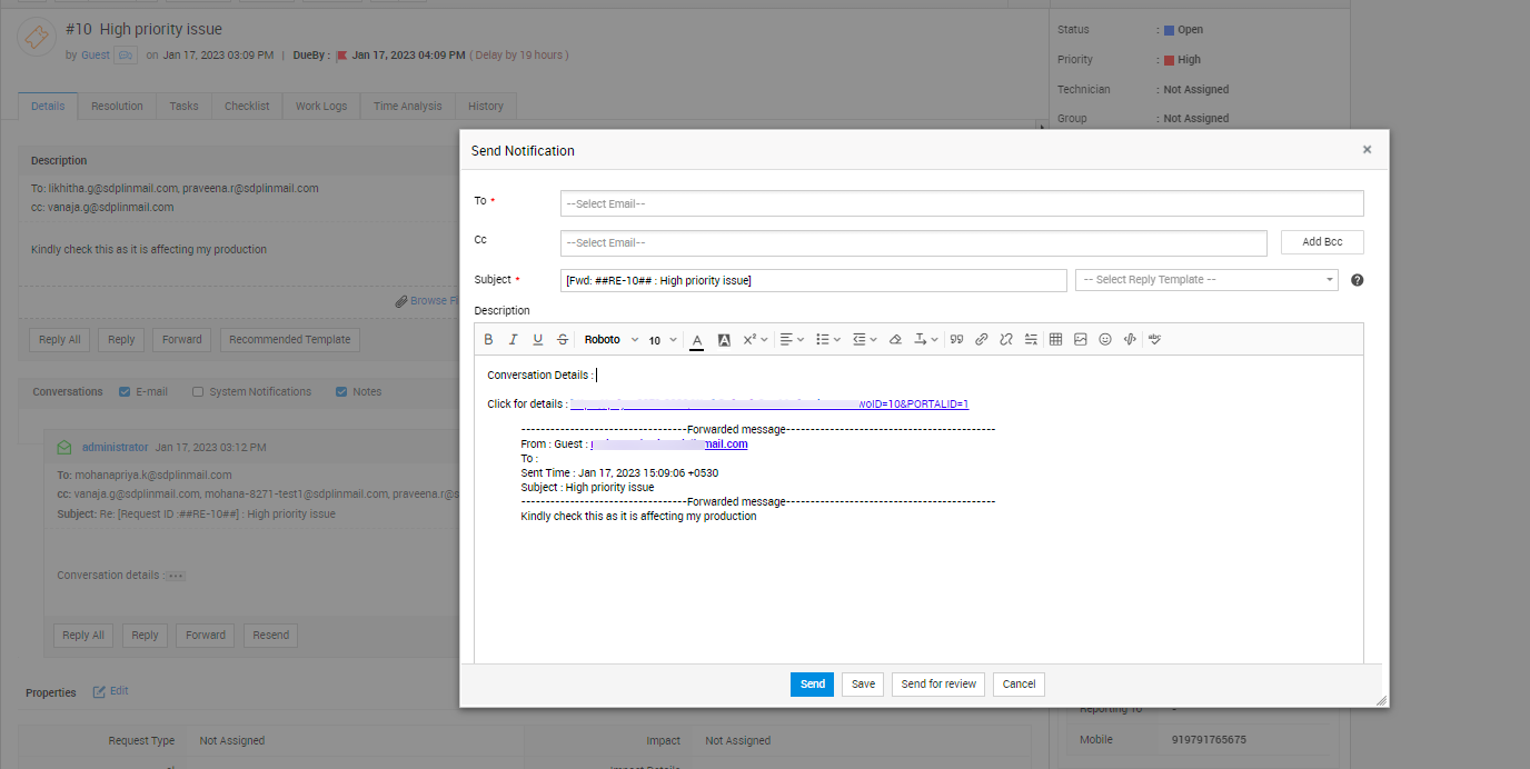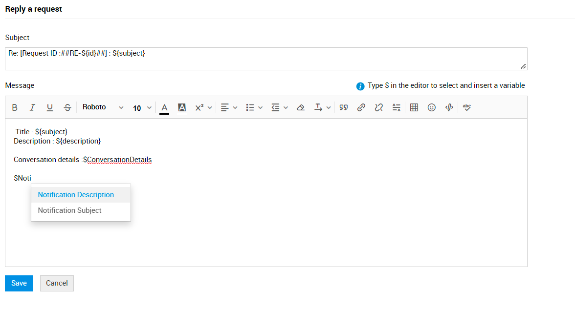 从版本 14104 开始,您可以在请求通知规则模板中使用变量 $ConversationsDetails(此前为 $lastconversationdetails)、$NotificationDescription 或 $NotificationSubject。