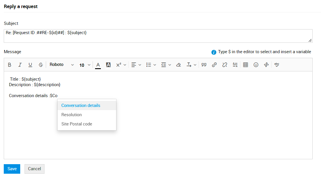 根据从请求对话或描述中选择“回复/转发”的情况,结合请求属性(请求者姓名、主题、描述、创建时间以及 TO/CC/BCC 字段)替换对话或描述内容。