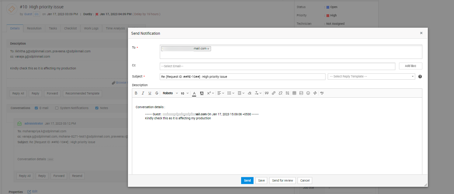 当技术人员通过电子邮件的回复被附加到请求中时,通知请求者和抄送用户。