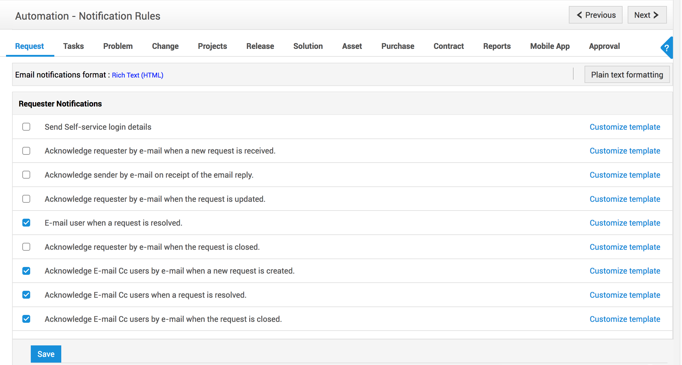 转到 管理 > 帮助台定制器 > 通知规则。