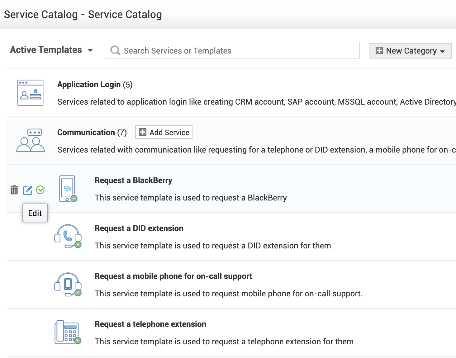 - 选择一个服务类别,然后单击您要配置基于角色审批的服务模板中的编辑图标。