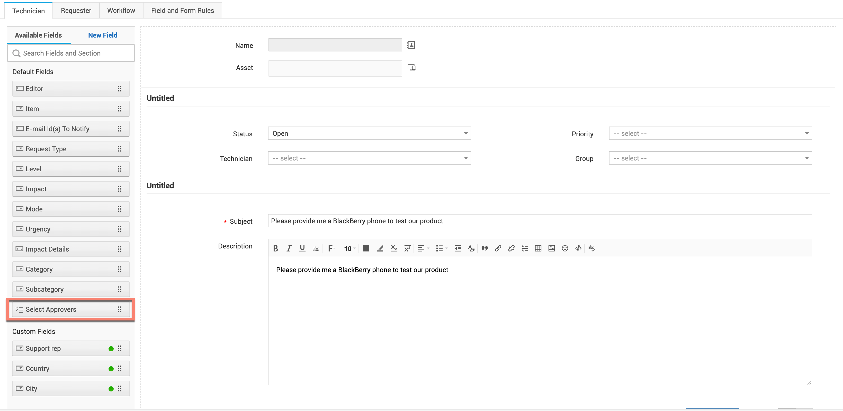 - 服务模板表单将打开。如果您希望请求者自行选择审批人,请从“表单设计器”选项卡中拖放“选择审批人”字段到模板中。