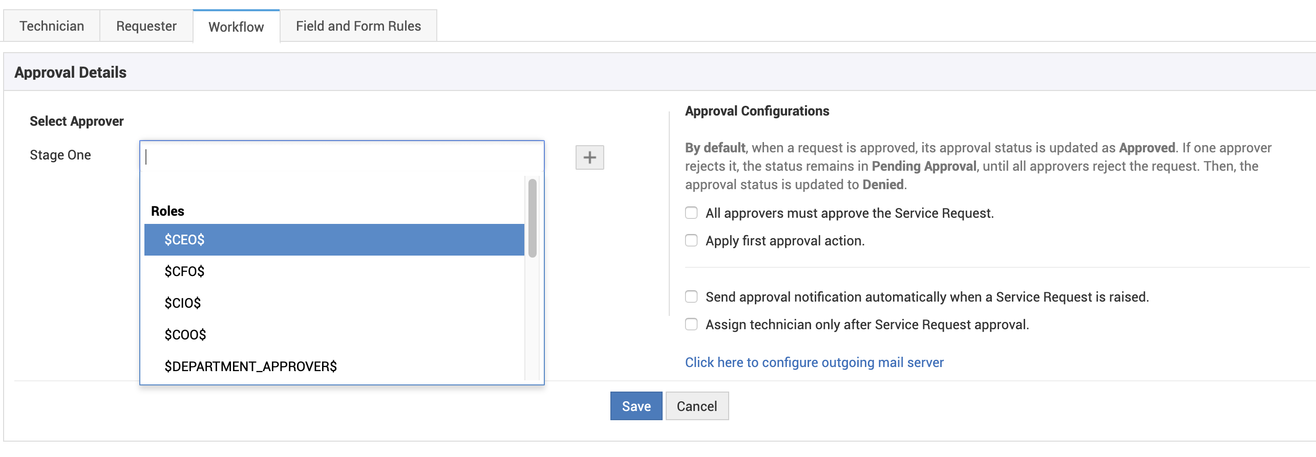 例如,在通信服务类别中的某个服务模板里,可以预先设置基于角色的审批人,这样,与该服务相关的所有服务请求都会被发送给您所选择的审批人。
