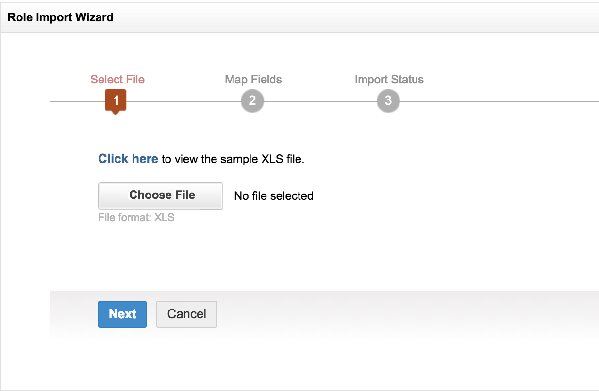 您可以使用“导入 XLS”选项从 Excel 表中导入角色和用户。将角色名称和用户从 Excel 表导入后,可使用字段映射选项进行字段映射。