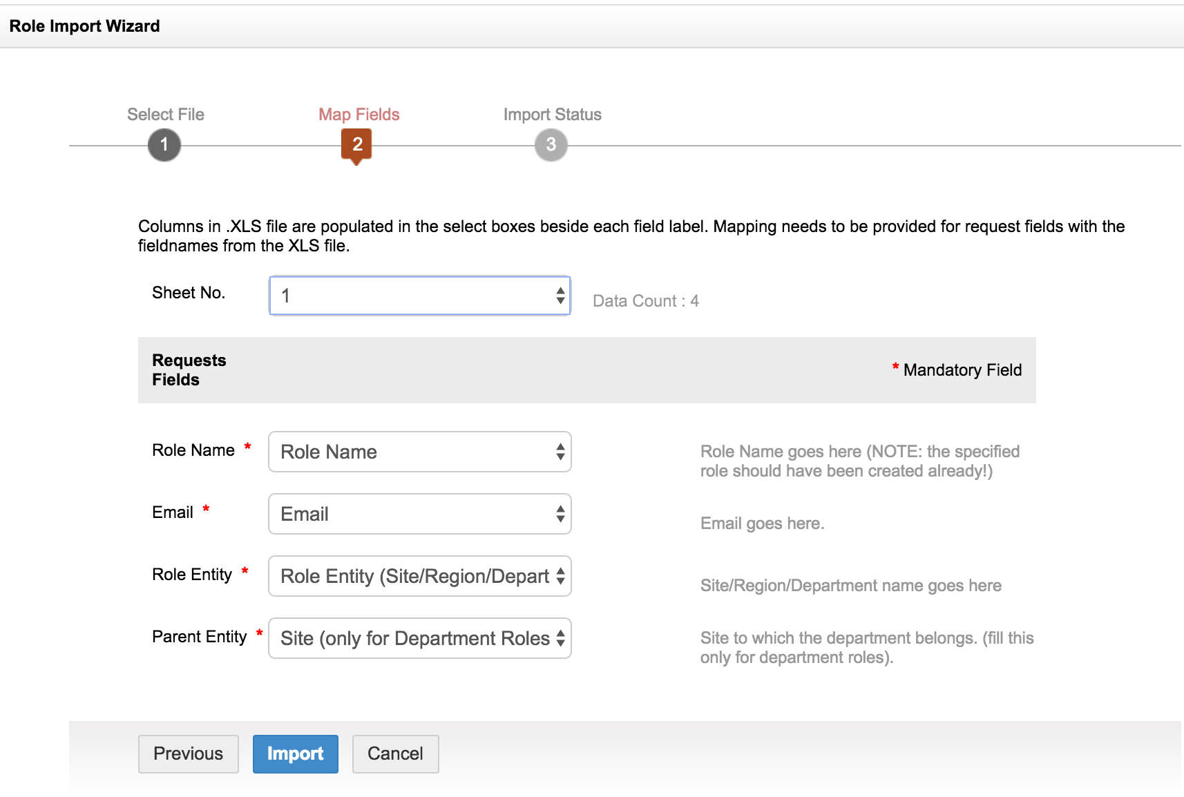 - 导入完成后,xls 文件中的列会填充到每个字段标签旁边的选择框中,例如“电子邮件”“角色名称”“角色实体”和“父实体”。