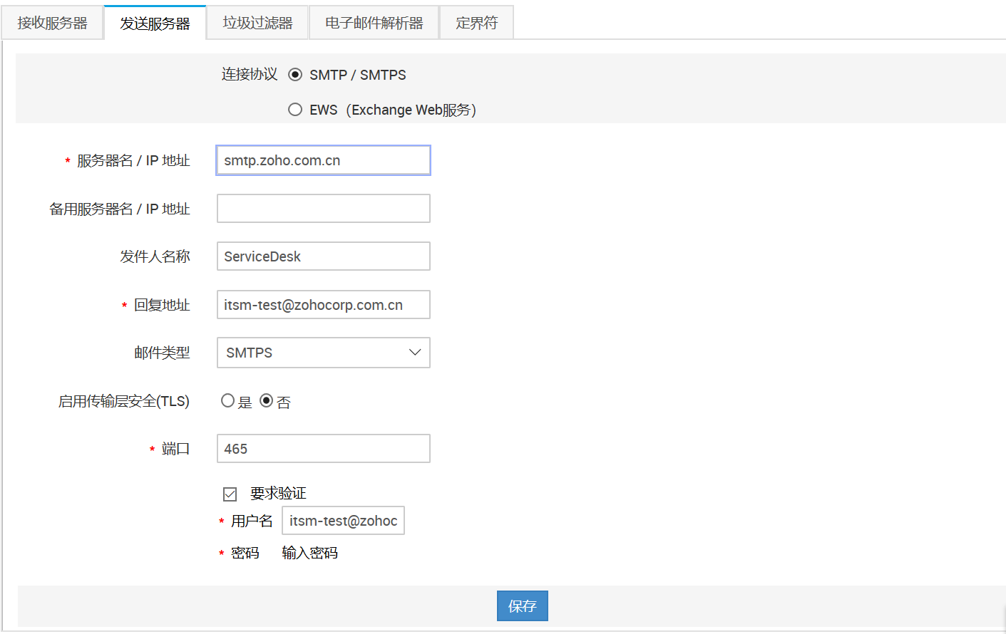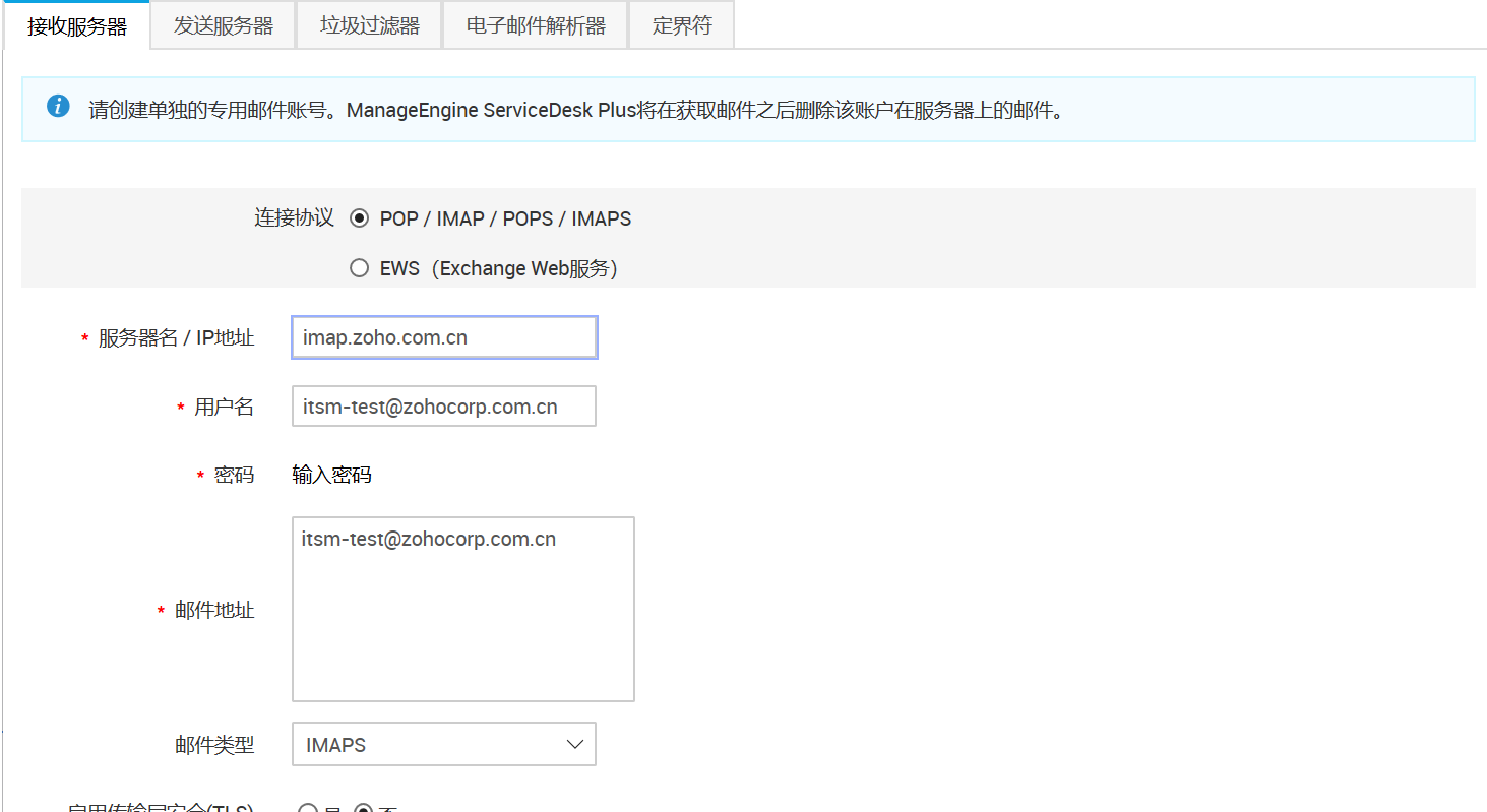 ServiceDesk Plus允许用户对接收邮件和发送邮件的服务器进行设置,以便获取发送到IT帮助台团队的邮件,并发送通知/反馈到技术人员、请求人和厂商。