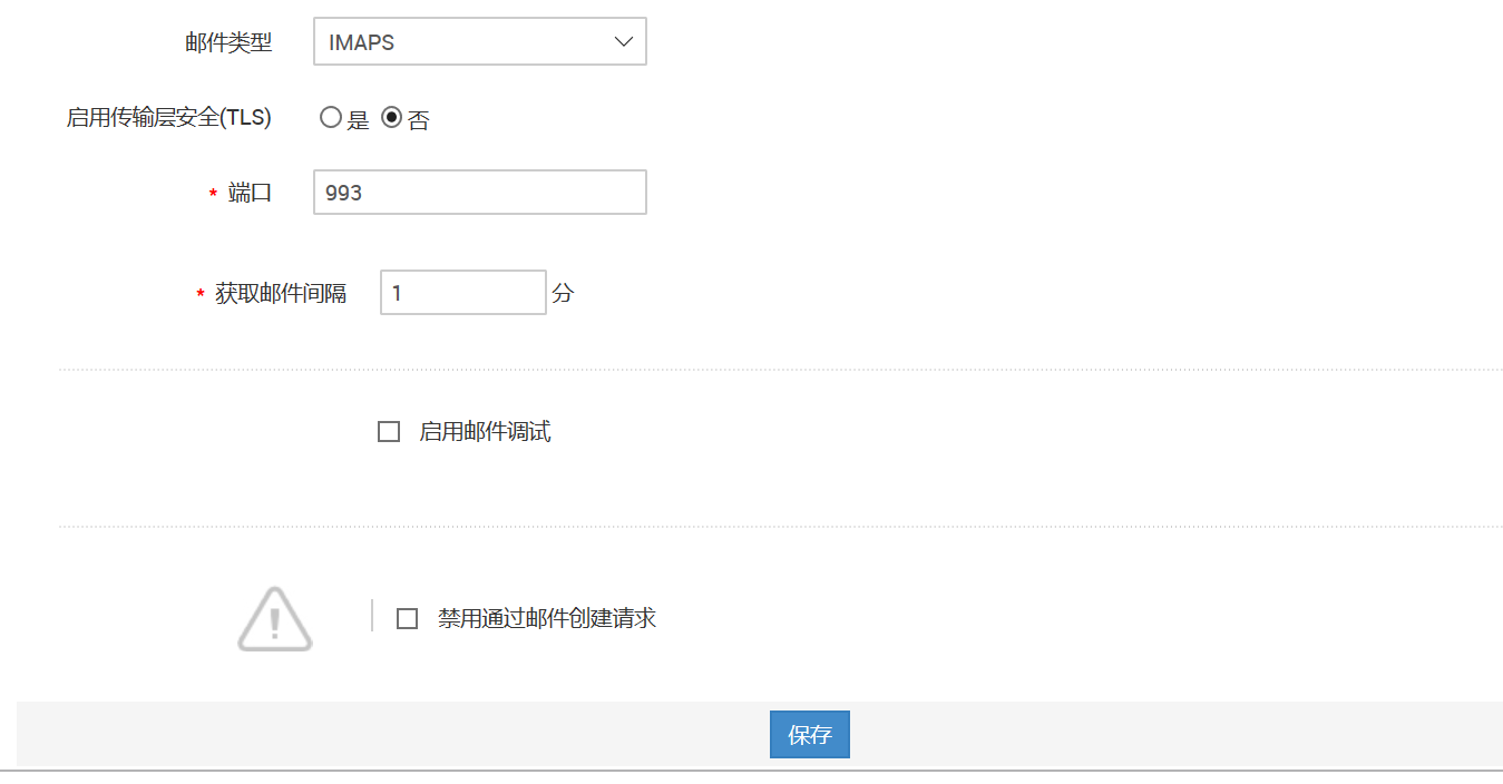 所有以 * 标示的条目都是必填的字段。请输入服务器名、用户名、密码、邮件地址、端口和获取邮件的时间间隔(分),并从邮件类型组合框中选择所需的值。