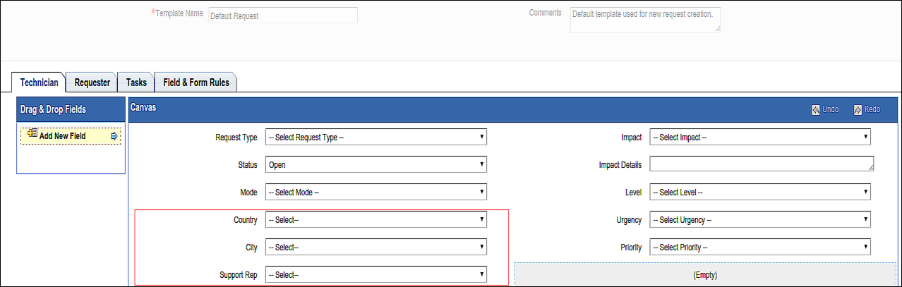 要对应上述场景,首先需要添加相应的附加字段 (Country, City and Support Rep) 及合适的值,然后将它们拖放到某个请求模板中。如下图所示: