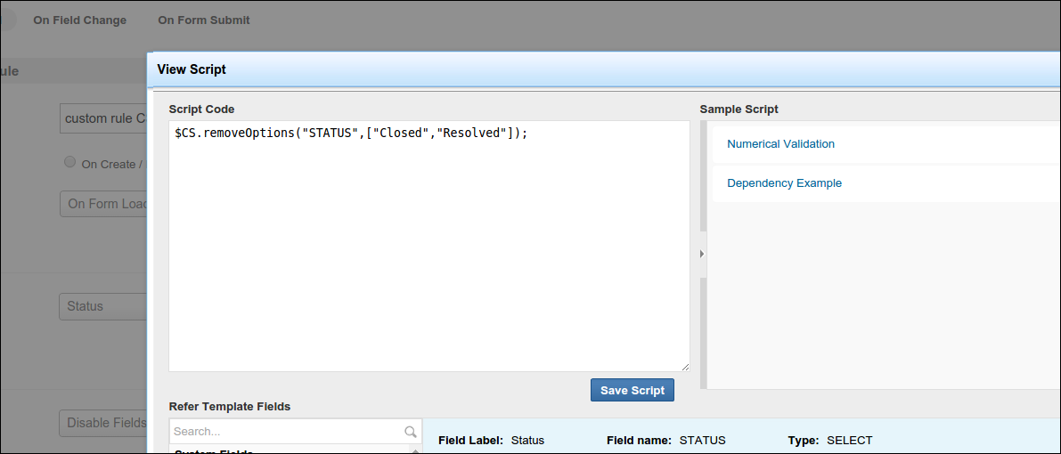 添加其它动作,选择"执行脚本",从状态字段中移除“Closed”和“Resloved”。