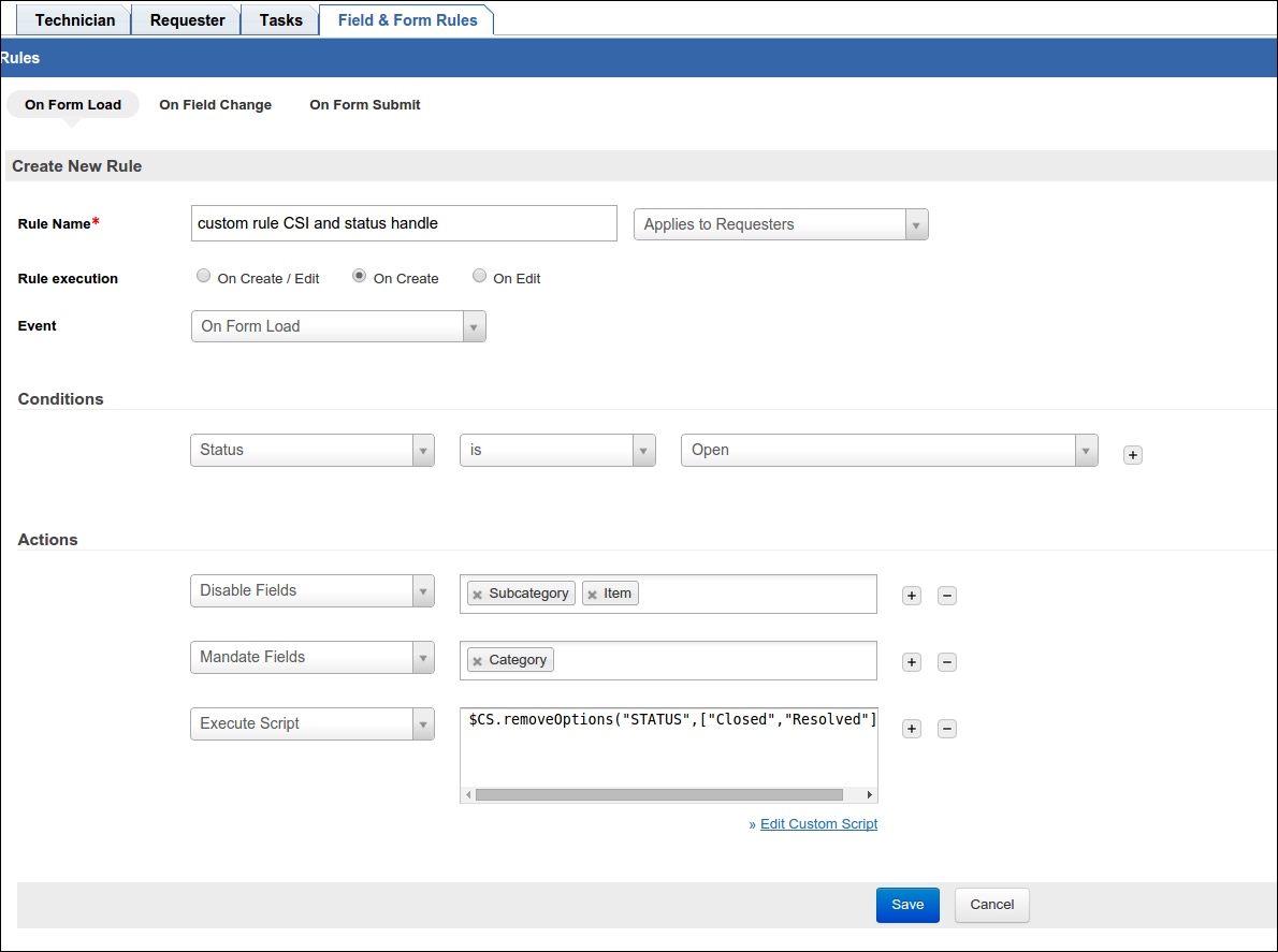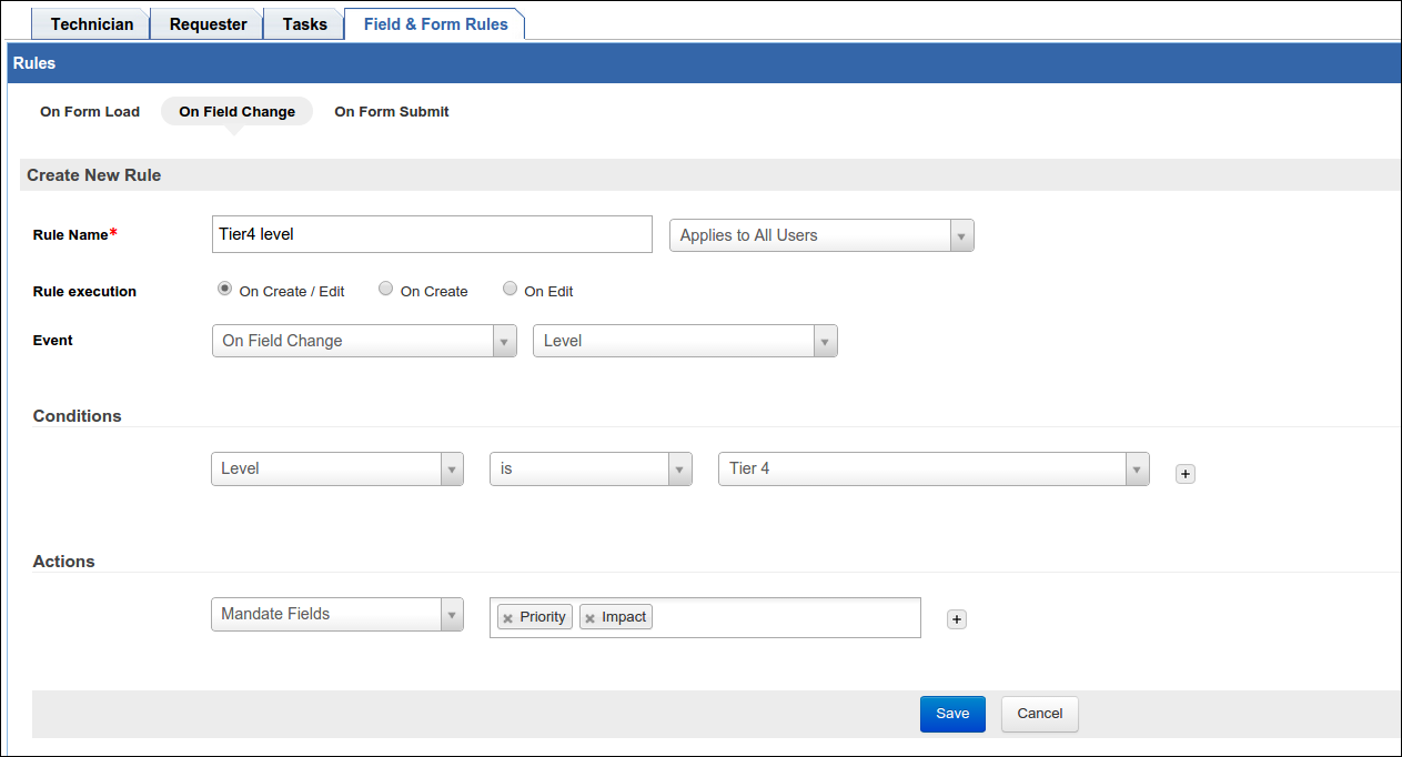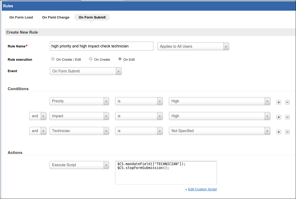 如果Priority 和 Impact 为 High ,而没有指派技术员,则停止表单提交,将技术员字段设置为必填项。