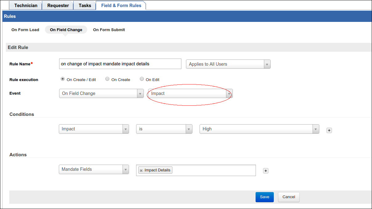 字段 Impact 被更改时,将 Impact Details 设置为必填项。