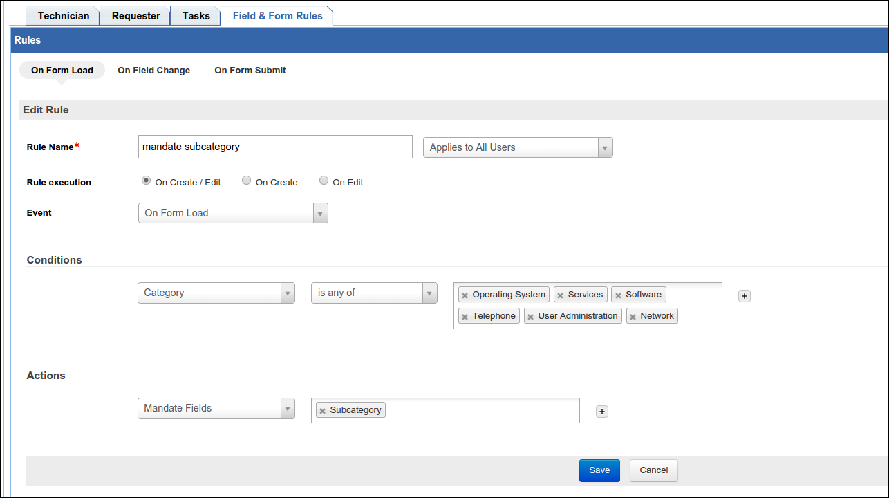 当分类为 Network, or Operating System, or Services, or Software, or Telephone. or User Administration时,将子分类设置为必填项。