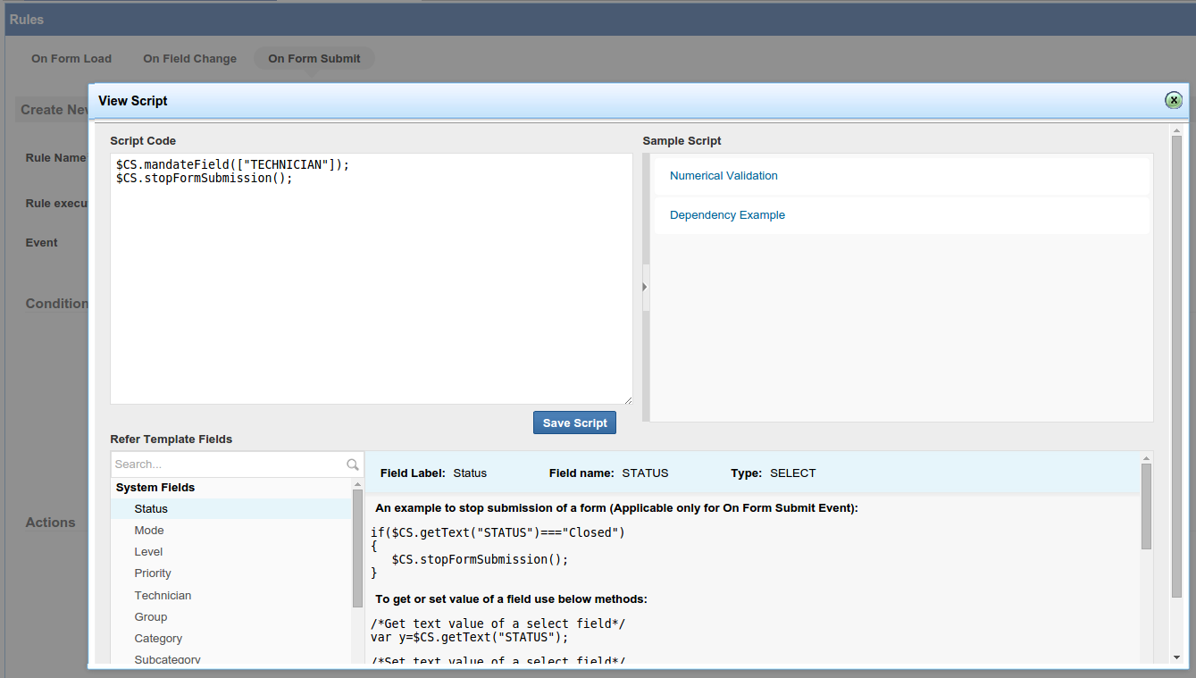 在动作部分,选择"执行脚本":编写自定义脚本,将技术员设置为必填字段,并停止提交