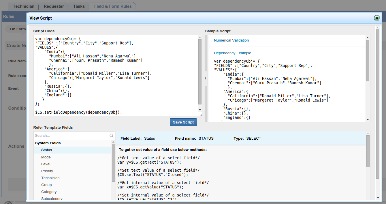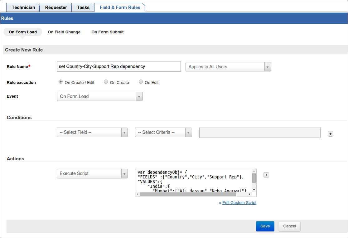 如: City 字段的选项依赖于 Country 的值,而 Support Rep 字段选项依赖于 City 字段的值。