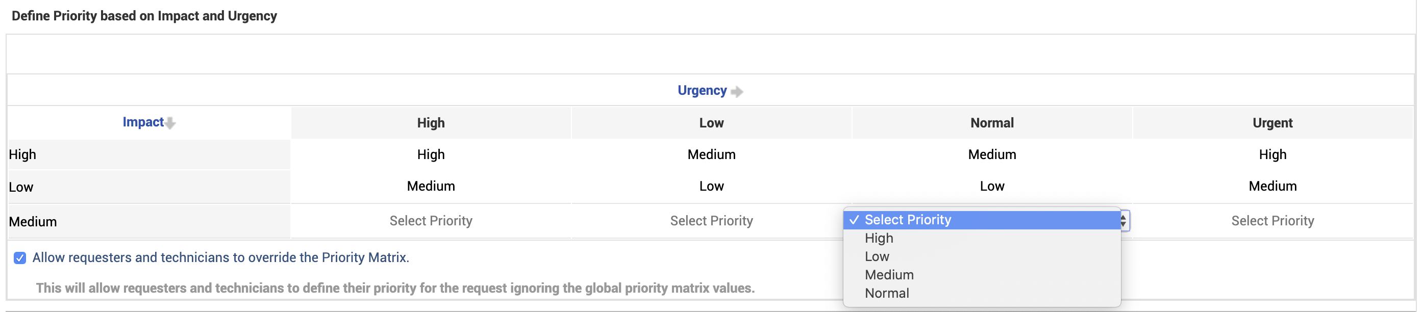 在“优先级矩阵”页面中,单击特定紧急程度和影响对应的优先级链接,这将打开下拉菜单。