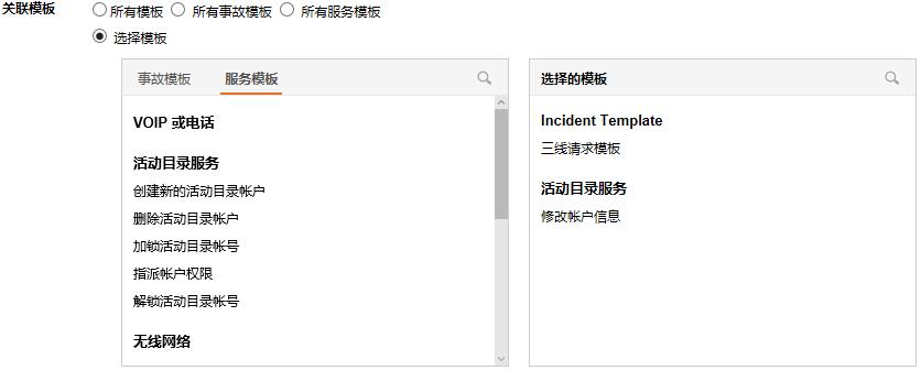 关联模板: 选择显示该菜单的请求所使用的模板。可用的值有:'所有模板', '所有事故模板', '所有服务请求模板', 或者'选择的模板'。