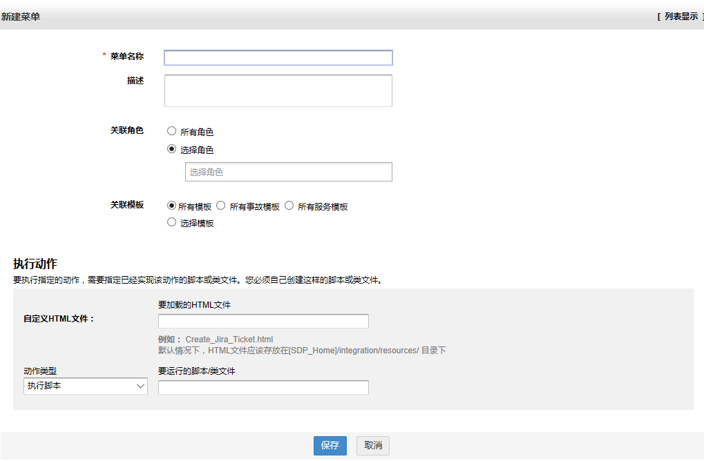 当点击该菜单时,加载所指定的自定义HTML文件。该文件需要存放在 [SDP_Home]/Integration/resources/ 目录下,扩展名支持 htt/htx/htm/html/htmls ,其中,在HTML文件中可呢使用到的JavaScript和CSS文件也必须存放在相同的位置。如:Create_Jira_Ticket.html
