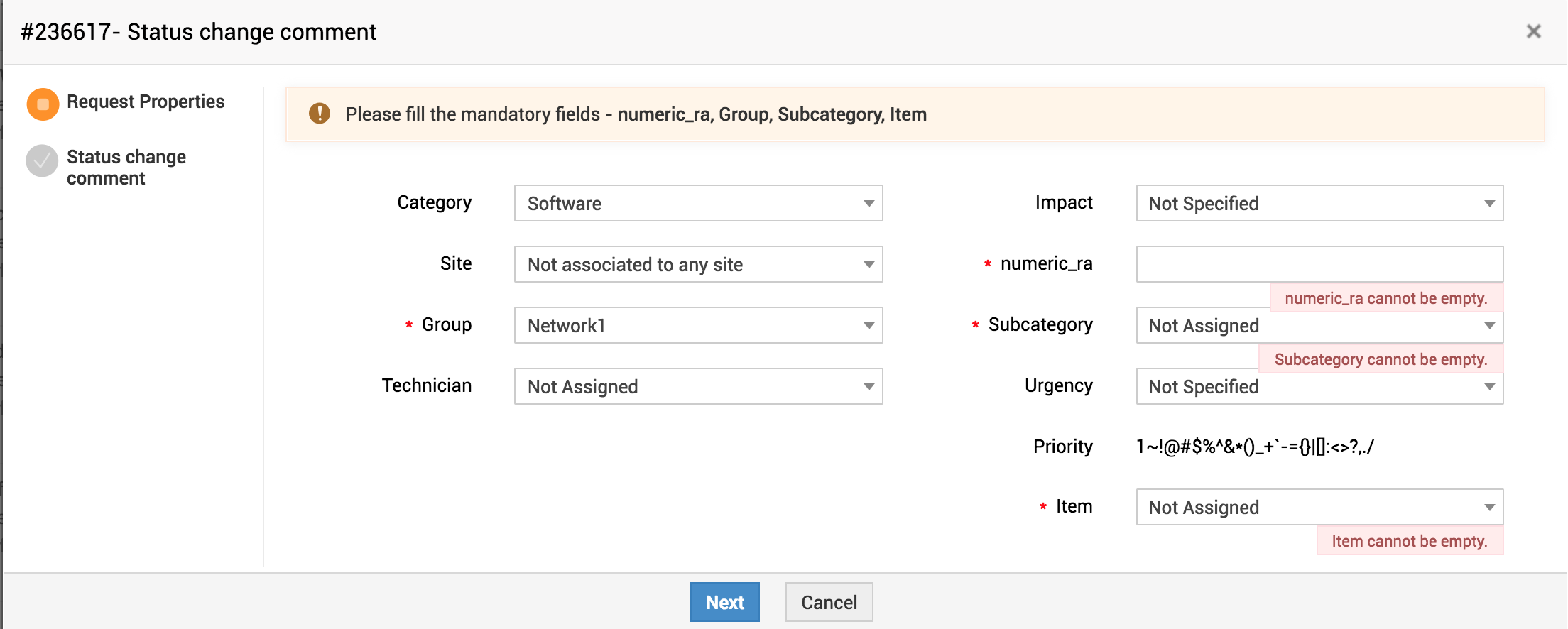使用“请求关闭向导”指导技术人员在关闭请求时填写遗漏的必填字段。当技术人员在未填写关闭规则(管理 >> 请求关闭规则)中配置的必填字段(如解决方案、类别/子类别等)的情况下关闭请求时,此功能会非常有用。系统将向技术人员显示一个提示窗口,并标记出遗漏的字段。技术人员可以填写这些字段,并直接从该处关闭请求。